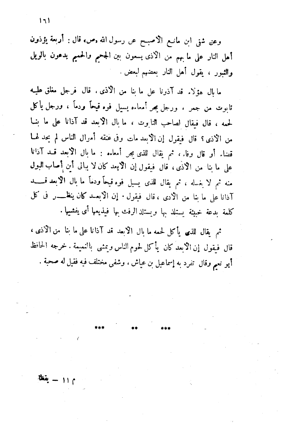 وَعَن شقى ابْن مَانع الأصبح عَن رَسُول الله صلى الله عَلَيْهِ وَسلم قَالَ أَرْبَعَة يُؤْذونَ أهل النَّار على مَا بهم من الْأَذَى يسعون بَين الْجَحِيم وَالْحَمِيم يدعونَ بِالْوَيْلِ وَالثُّبُور يَقُول أهل لنار بَعضهم لبَعض