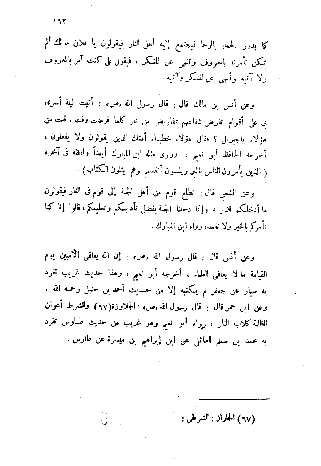 وَعَن أنس قَالَ قَالَ رَسُول الله صلى الله عَلَيْهِ وَسلم إِن الله يعافى الْأُمِّيين يَوْم الْقِيَامَة مَالا يعافى الْعلمَاء أخرجه أَبُو نعيم وَهَذَا حَدِيث غَرِيب تفرد بِهِ سيار عَن جَعْفَر لم يَكْتُبهُ إِلَّا من حَدِيث أَحْمد بن حَنْبَل رَحمَه الله وَعَن ابْن عمر قَالَ قَالَ رَسُول الله صلى الله عَلَيْهِ وَسلم الجلاوزة وللشرط أعوان الظلمَة كلاب النَّار رَوَاهُ أَبُو نعيم وَهُوَ غَرِيب من حَدِيث طَاوس تفرد بِهِ مُحَمَّد بن مُسلم الطائفى عَن ابْن إِبْرَاهِيم بن ميسرَة عَن طَاوس