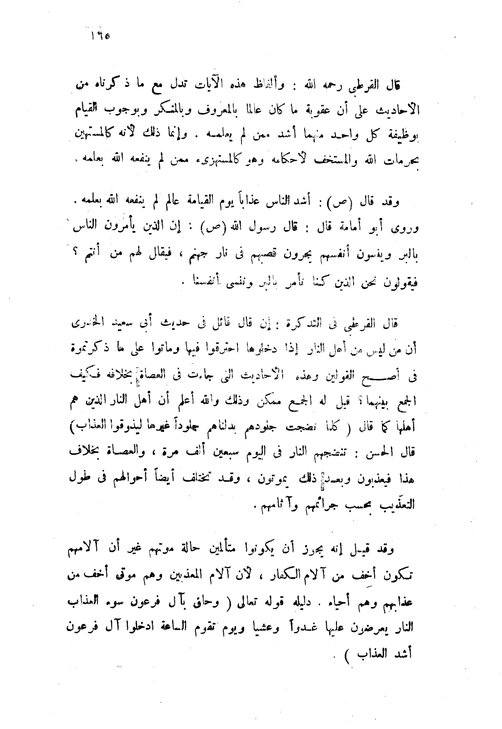 قَالَ القرطبى فى التَّذْكِرَة إِن قَالَ قَائِل فى حَدِيث أَبى سعيد الخدرى أَن من لَيْسَ من أهل النَّار إِذا دخلوها احترقوا فِيهَا وماتوا على مَا ذكرتموه فى أصح الْقَوْلَيْنِ وَهَذِه الْأَحَادِيث الَّتِى جَاءَت فى العصاة بِخِلَاف فَكيف الْجمع بَينهمَا قيل لَهُ الْجمع مُمكن وَذَلِكَ وَالله أعلم أَن أهل النَّار الَّذين هم أَهلهَا كَمَا قَالَ {كلما نَضِجَتْ جُلُودهمْ بَدَّلْنَاهُمْ جُلُودًا غَيرهَا ليذوقوا الْعَذَاب} قَالَ الْحسن تنضجهم النَّار فى الْيَوْم سبعين ألف مرّة والعصاة بِخِلَاف هَذَا فيعذبون وَبعد ذَلِك يموتون وَقد تخْتَلف أَيْضا أَحْوَالهم فى طول التعذيب بِحَسب جرائمهم وآثامهم