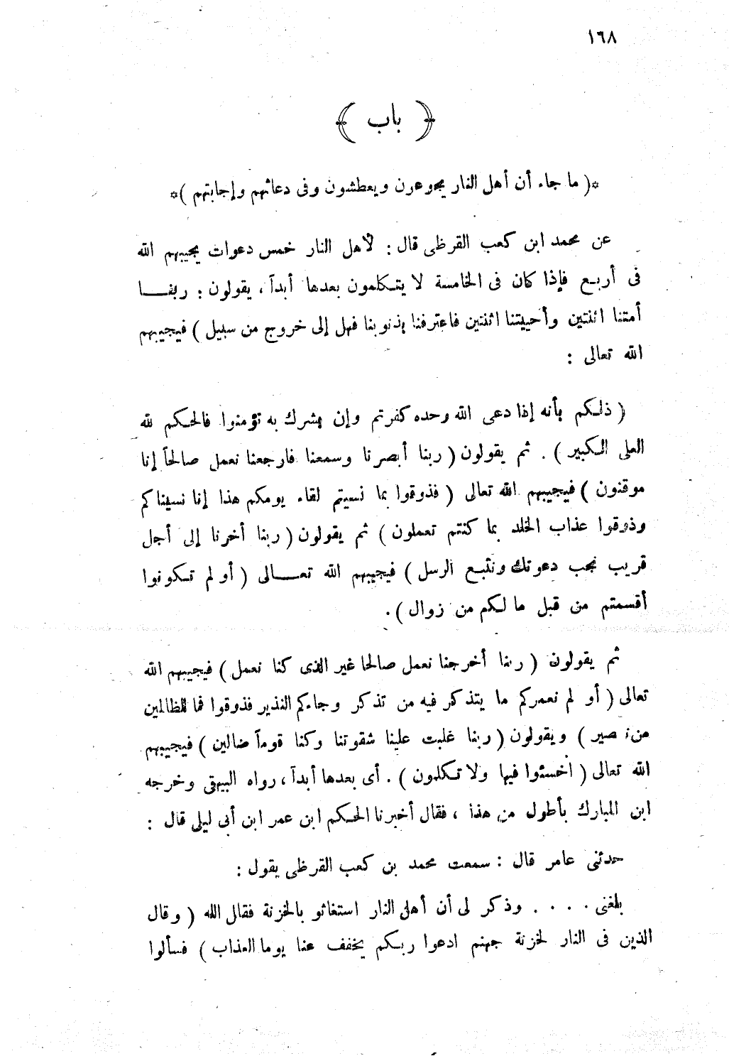 عَن مُحَمَّد ابْن كَعْب القرظى قَالَ لأهل النَّار خمس دعوات يُجِيبهُمْ الله فى أَربع فَإِذا كَانَ فى الْخَامِسَة لَا يَتَكَلَّمُونَ بعْدهَا أبدا يَقُولُونَ رَبنَا أمتنَا اثْنَتَيْنِ وأحييتنا اثْنَتَيْنِ فاعترفنا بذنوبنا فَهَل إِلَى فخروج من سَبِيل فَيُجِيبهُمْ الله تَعَالَى {ذَلِكُم بِأَنَّهُ إِذا دعِي الله وَحده كَفرْتُمْ وَإِن يُشْرك بِهِ تؤمنوا فَالْحكم لله الْعلي الْكَبِير} ثمَّ يَقُولُونَ {رَبنَا أبصرنا وَسَمعنَا فارجعنا نعمل صَالحا إِنَّا موقنون} فَيُجِيبهُمْ الله تَعَالَى {فَذُوقُوا بِمَا نسيتم لِقَاء يومكم هَذَا إِنَّا نسيناكم وذوقوا عَذَاب الْخلد بِمَا كُنْتُم تَعْمَلُونَ} ثمَّ يَقُولُونَ {رَبنَا أخرنا إِلَى أجل قريب نجب دعوتك وَنَتبع الرُّسُل} فَيُجِيبهُمْ الله تَعَالَى أَو لم تَكُونُوا أقسمتم من قبل مالكم من زَوَال