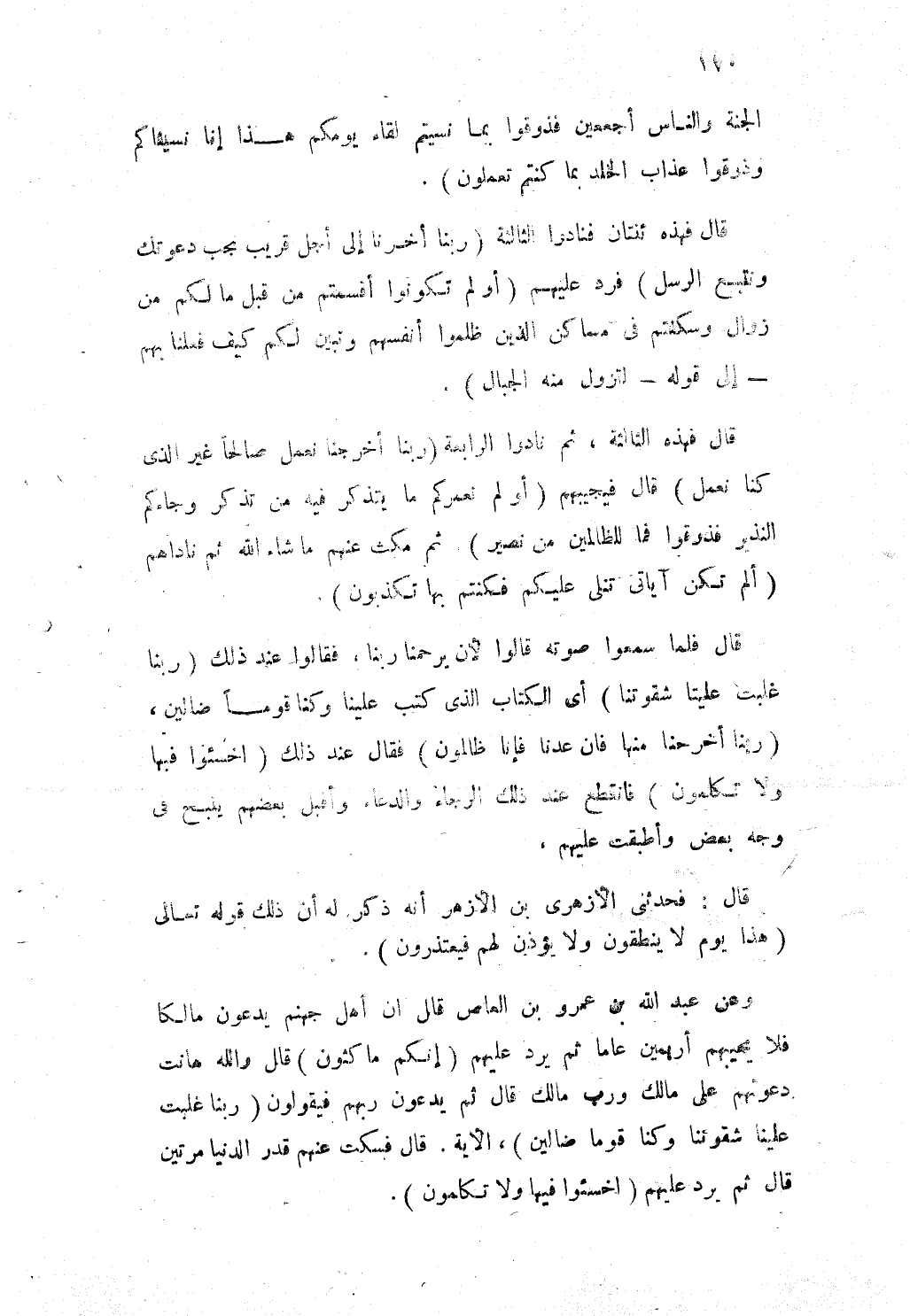 قَالَ فَهَذِهِ الثَّالِثَة ثمَّ نادوا الرَّابِعَة {رَبنَا أخرجنَا نعمل صَالحا غير الَّذِي كُنَّا نعمل} قَالَ فَيُجِيبهُمْ أَو لم نُعَمِّركُمْ مَا يتَذَكَّر فِيهِ من تذكر وَجَاءَكُم النذير فَذُوقُوا فَمَا للظالمين من نصير ثمَّ مكث عَنْهُم مَا شَاءَ الله ثمَّ ناداهم {ألم تكن آياتي تتلى عَلَيْكُم فكنتم بهَا تكذبون}