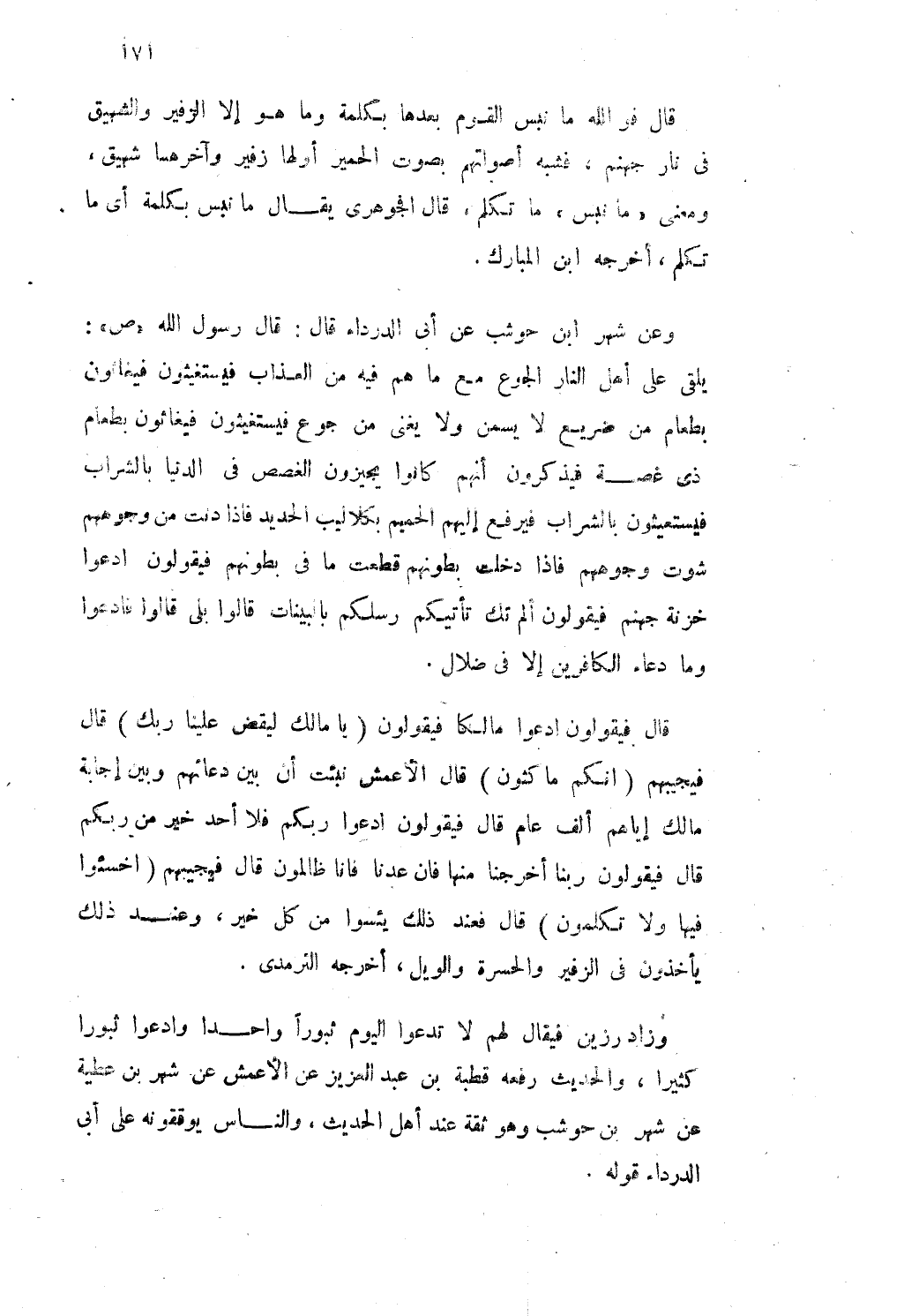 وَعَن شهر ابْن حَوْشَب عَن ابى الدَّرْدَاء قَالَ قَالَ رَسُول الله صلى الله عَلَيْهِ وَسلم يلقى على أهل النَّار الْجُوع مَعَ مَا هم فِيهِ من الْعَذَاب فَيَسْتَغِيثُونَ فَيُغَاثُونَ بِطَعَام من ضَرِيع لَا يسمن وَلَا يُغني من جوع فَيَسْتَغِيثُونَ فَيُغَاثُونَ بِطَعَام ذى غُصَّة فَيذكرُونَ أَنهم كَانُوا يجيزون الْغصَص فِي الدُّنْيَا بِالشرابِ فَيَسْتَغِيثُونَ بِالشرابِ فيرفع إِلَيْهِم الْحَمِيم بِكَلَالِيب الْحَدِيد فاذا دنت من وُجُوههم شَوَتْ وُجُوههم فَإِذا دخلت بطونهم قطعت مَا فِي بطونهم فَيَقُولُونَ ادعوا خَزَنَة جَهَنَّم فَيَقُولُونَ ألم تَكُ تَأْتيكُمْ رسلكُمْ بِالْبَيِّنَاتِ قَالُوا بلَى قَالُوا فَادعوا وَمَا دُعَاء الْكَافرين إِلَّا فى ضلال
