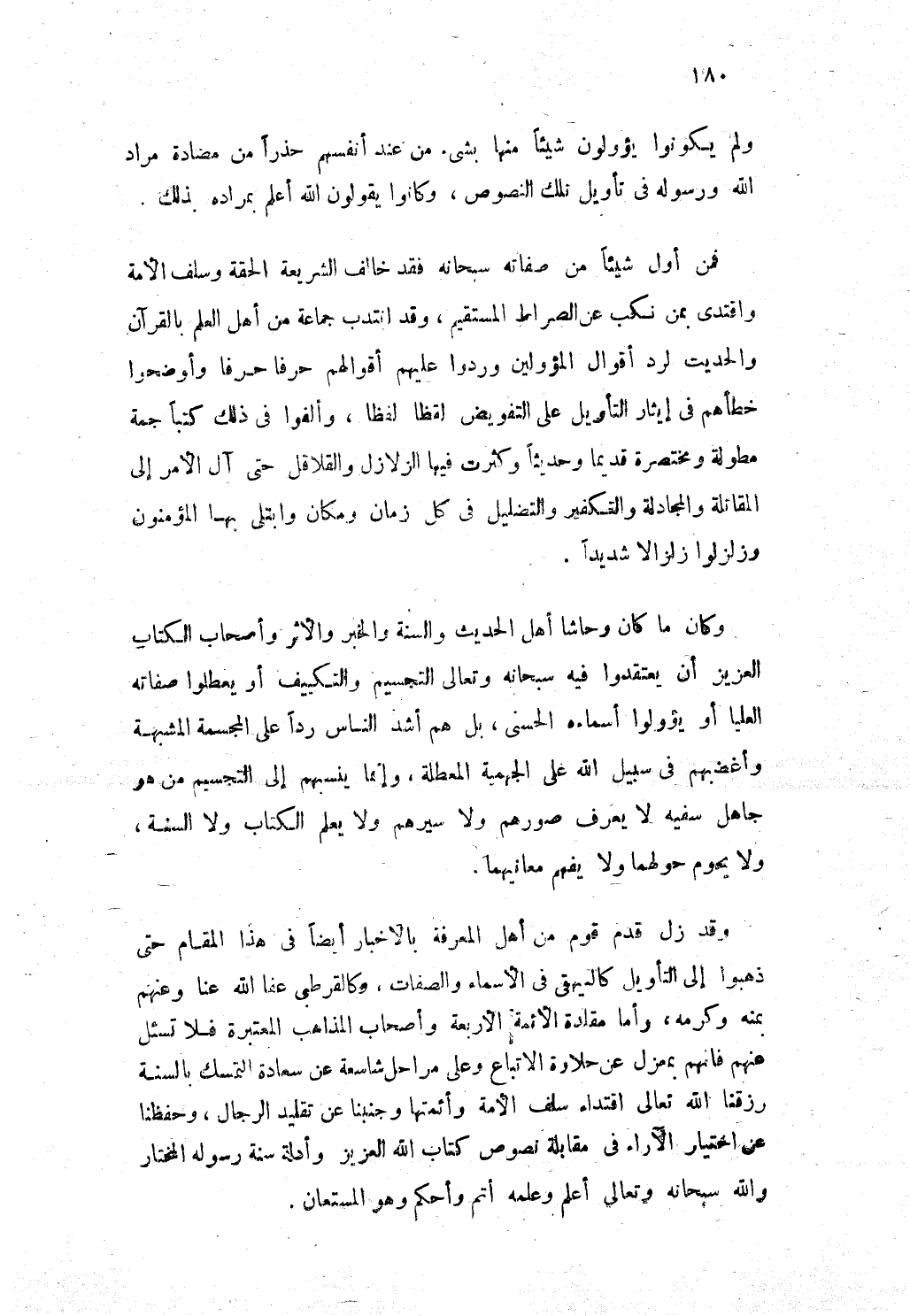 وَكَانَ مَا كَانَ وحاشا أهل الحَدِيث وَالسّنة وَالْخَبَر والأثر وَأَصْحَاب الْكتاب الْعَزِيز أَن يعتقدوا فِيهِ سُبْحَانَهُ وَتَعَالَى التجسيم والتكييف أَو يعطلوا صِفَاته الْعليا أَو يؤولوا أسماءه الْحسنى بل هم أَشد النَّاس ردا على المجسمة المشبهة وأغضبهم فى سَبِيل الله على الْجَهْمِية المعطلة وَإِنَّمَا ينسبهم إِلَى التجسيم من هُوَ جَاهِل سَفِيه لَا يعرف صورهم وَلَا سيرهم وَلَا يعلم الْكتاب وَلَا السّنة وَلَا يحوم حولهما وَلَا يفهم معانيهما