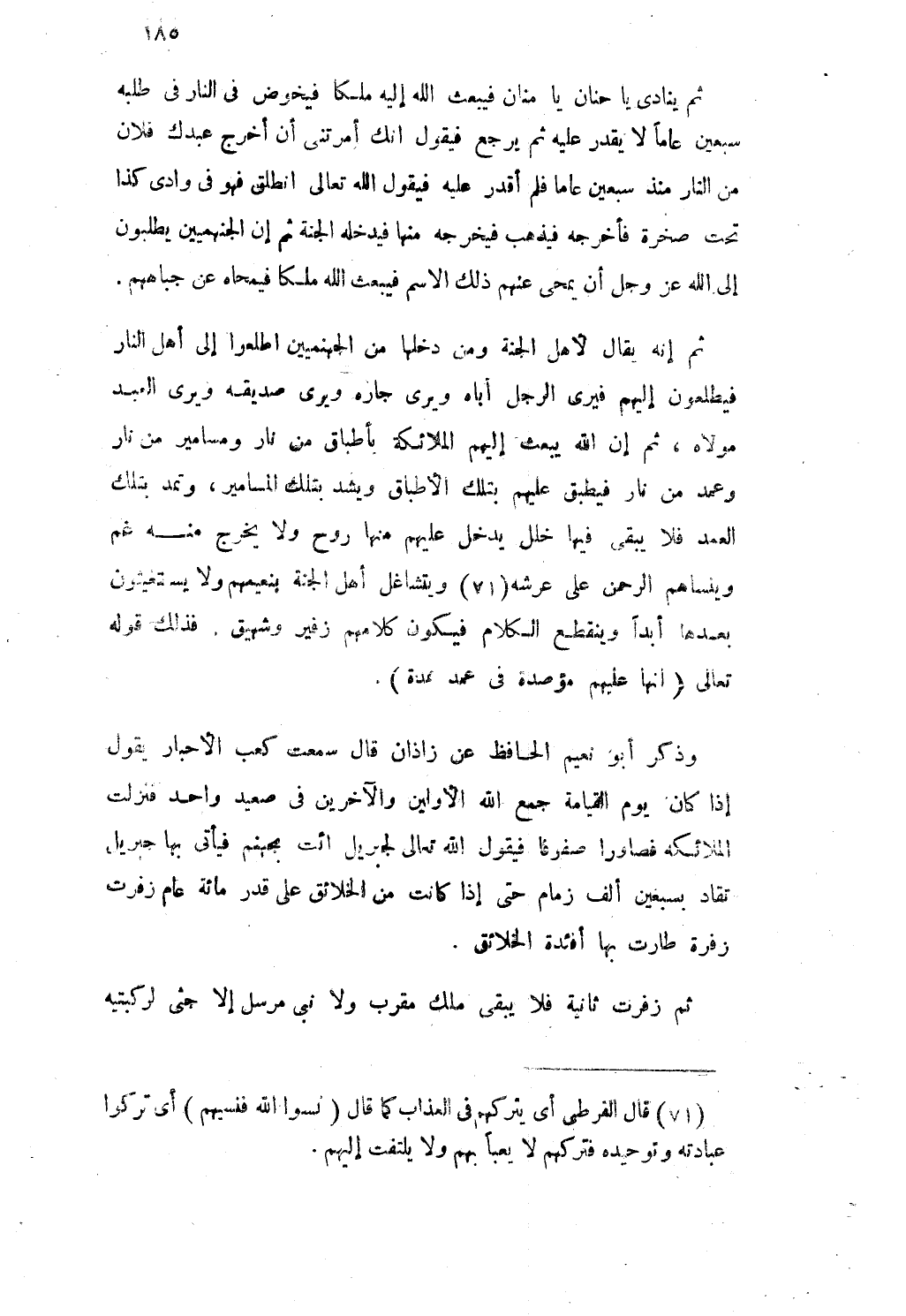 ثمَّ إِنَّه يُقَال لأهل الْجنَّة وَمن دَخلهَا من الجهنميين اطلعوا إِلَى أهل النَّار فيطلعون إِلَيْهِم فَيرى الرجل أَبَاهُ وَيرى جَاره وَيرى صديقه وَيرى العَبْد مَوْلَاهُ ثمَّ إِن الله يبْعَث إِلَيْهِم الْمَلَائِكَة بأطباق من نَار ومسامير من نَار وَعمد من نَار فيطبق عَلَيْهِم بِتِلْكَ الأطباق ويشد بِتِلْكَ المسامير وتمد بِتِلْكَ الْعمد فَلَا يبْقى فِيهَا خلل يدْخل عَلَيْهِم مِنْهَا روح وَلَا يخرج مِنْهُ غم وينساهم الرَّحْمَن على عَرْشه ويتشاغل أهل الْجنَّة بنعيمهم وَلَا يستغيثون بعْدهَا أبدا وَيَنْقَطِع الْكَلَام فَيكون كَلَامهم زفير وشهيق فَذَلِك قَوْله تَعَالَى انها عَلَيْهِم مؤصدة فى عمد ممددة