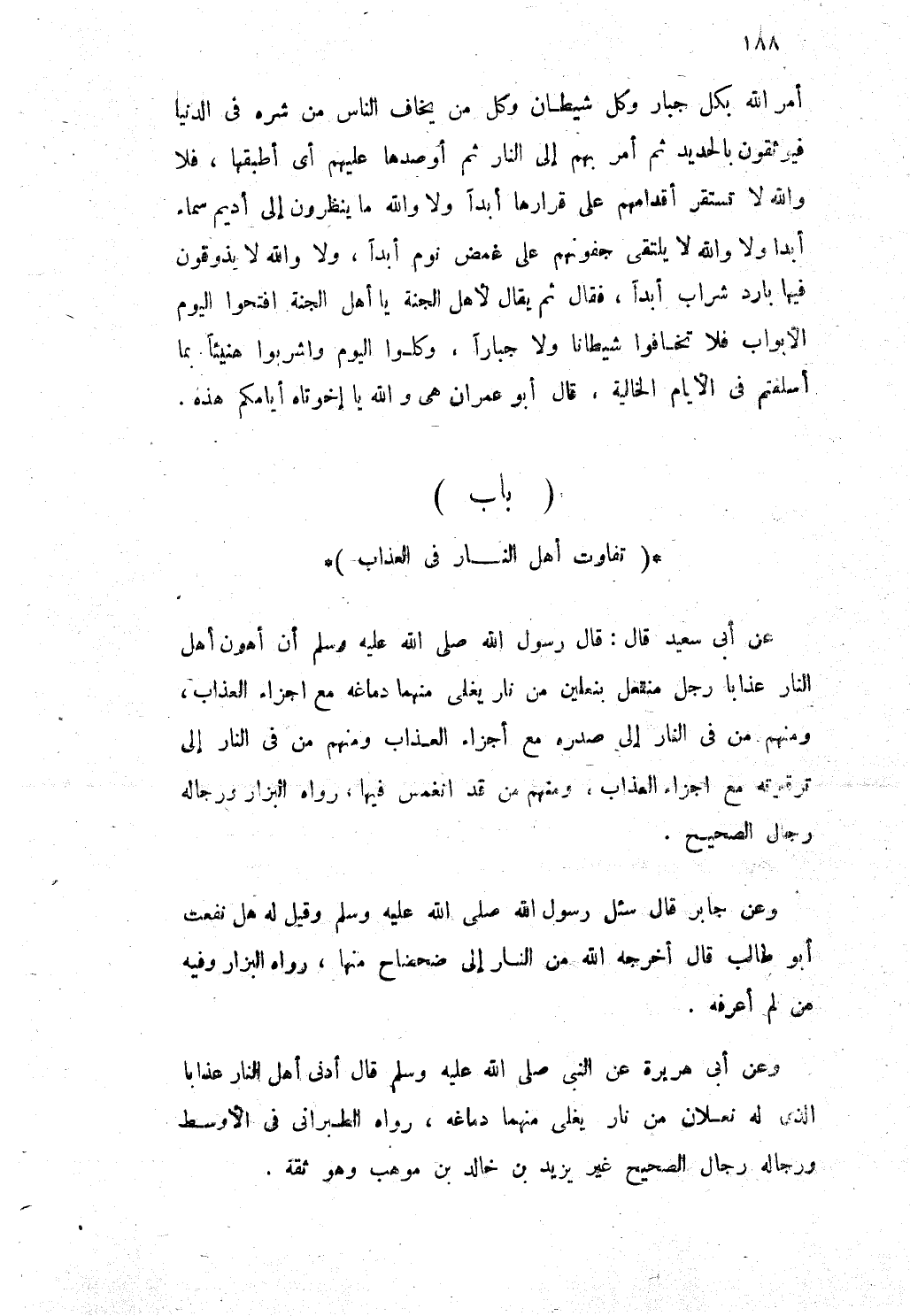 وَعَن أَبى هُرَيْرَة عَن النبى صلى الله عَلَيْهِ وَسلم قَالَ أدنى أهل النَّار عذَابا الذى لَهُ نَعْلَانِ من نَار يغلى مِنْهُمَا دماغه رَوَاهُ الطبرانى فى الْأَوْسَط وَرِجَاله رجال الصَّحِيح غير يزِيد بن خَالِد بن موهب وَهُوَ ثِقَة
