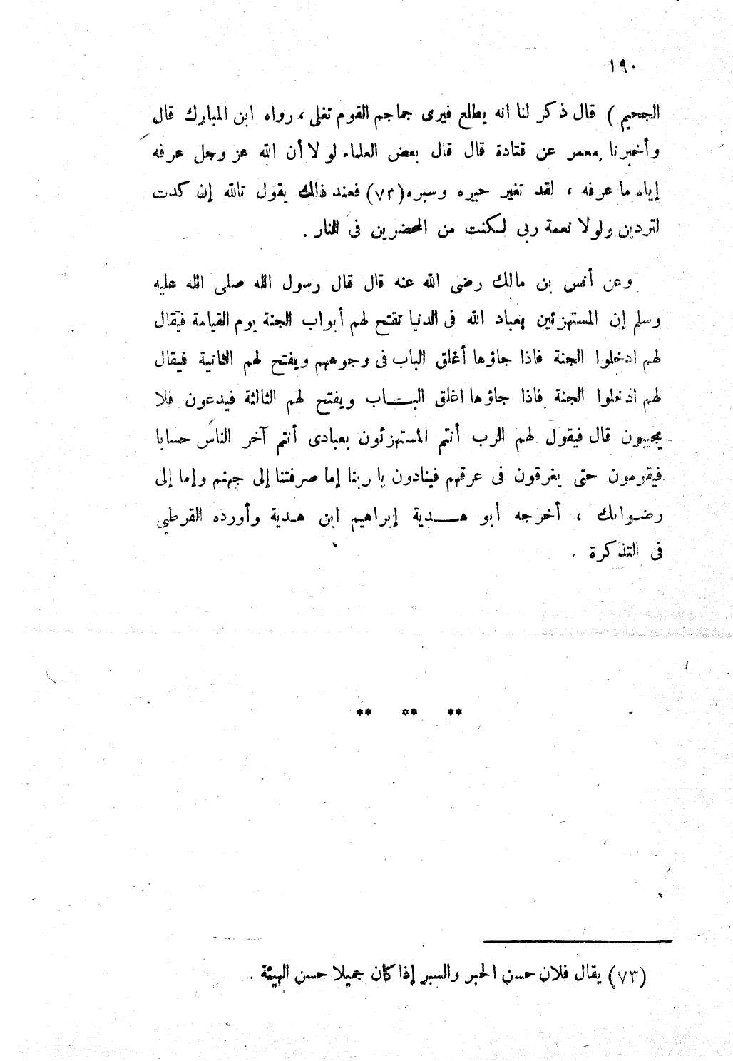 وَعَن أنس بن مَالك رَضِي الله عَنهُ قَالَ قَالَ رَسُول الله صلى الله عَلَيْهِ وَسلم إِن الْمُسْتَهْزِئِينَ بعباد الله فِي الدُّنْيَا تفتح لَهُم ابواب الْجنَّة يَوْم الْقِيَامَة فَيُقَال لَهُم ادخُلُوا الْجنَّة فاذا جاؤها أغلق الْبَاب فى وُجُوههم وَيفتح لَهُم الثَّانِيَة فَيُقَال لَهُم ادخُلُوا الْجنَّة فَإِذا جاؤها أغلق الْبَاب وَيفتح لَهُم الثَّالِثَة فَيدعونَ فَلَا يجيبون قَالَ فَيَقُول لَهُم الرب أَنْتُم المستهزئون بعبادى أَنْتُم آخر النَّاس حسابا فَيقومُونَ حَتَّى يغرقون فى عرقهم فينادون يَا رَبنَا إِمَّا صرفتنا إِلَى جَهَنَّم وَإِمَّا إِلَى رضوانك أخرجه أَبُو هَدِيَّة إِبْرَاهِيم ابْن هَدِيَّة وَأوردهُ القرطبى فى التَّذْكِرَة