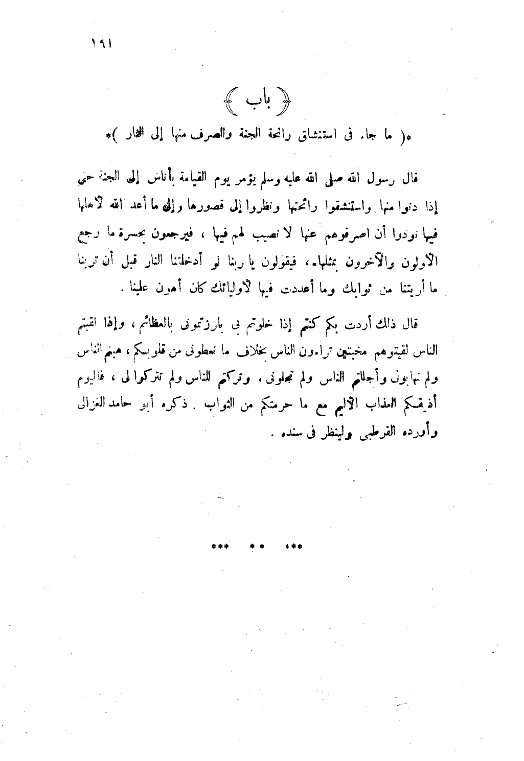 قَالَ رَسُول الله صلى الله عَلَيْهِ وَسلم يُؤمر يَوْم الْقِيَامَة بأناس إِلَى الْجنَّة حَتَّى إِذا دنوا مِنْهَا واستنشقوا رائحتها ونظروا إِلَى قُصُورهَا وَإِلَى مَا أعد الله لأَهْلهَا فِيهَا نُودُوا أَن اصرفوهم عَنْهَا لَا نصيب لَهُم فِيهَا فيرجعون بحسرة مَا رَجَعَ الْأَولونَ وَالْآخرُونَ بِمِثْلِهَا فَيَقُولُونَ يَا رَبنَا لَو أدخلتنا النَّار قبل أَن ترينا مَا أريتنا من ثوابك وَمَا أَعدَدْت فِيهَا لأوليائك كَانَ أَهْون علينا
