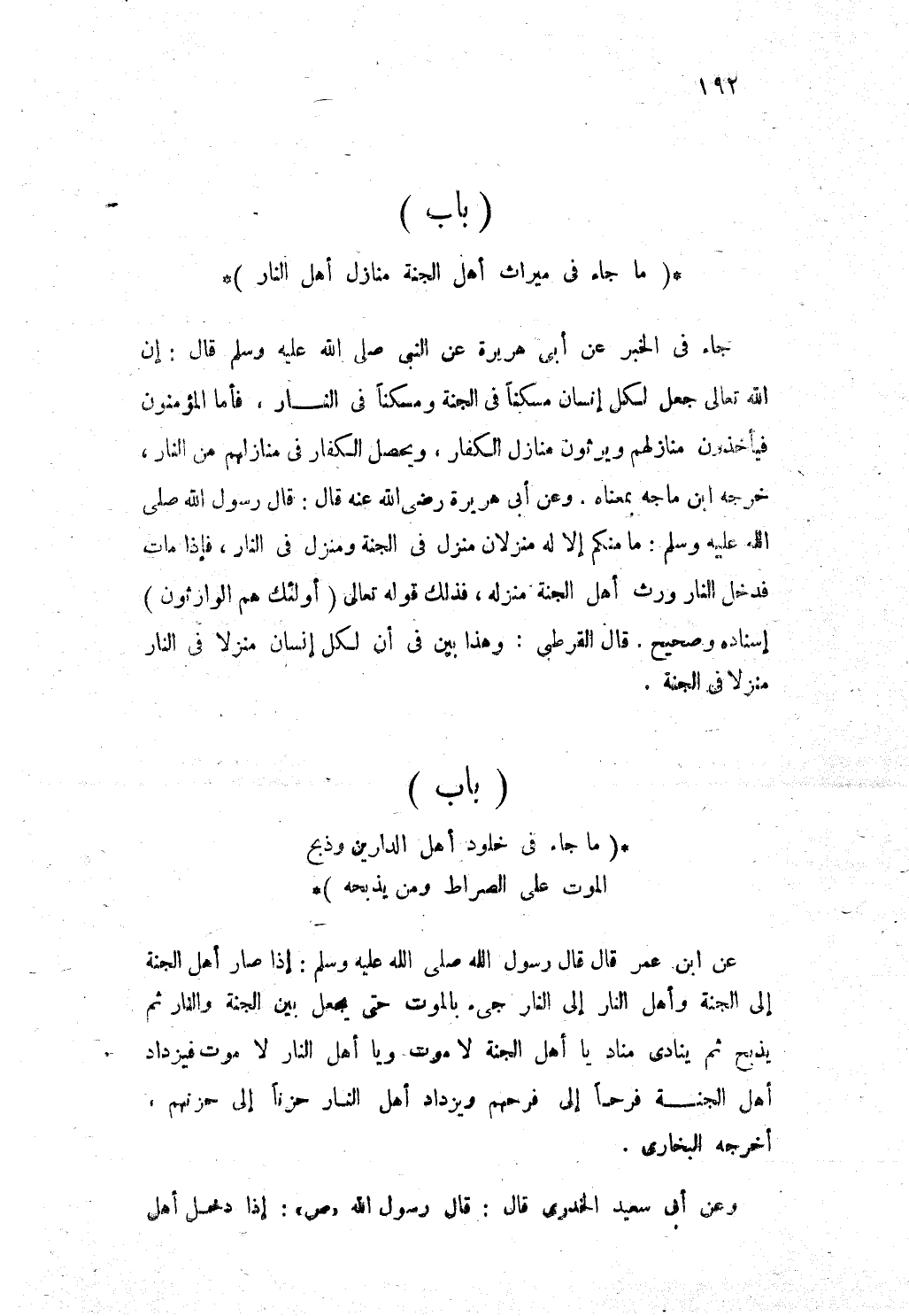 عَن ابْن عمر قَالَ قَالَ رَسُول الله صلى الله عَلَيْهِ وَسلم إِذا صَار أهل الْجنَّة إِلَى الجنه وَأهل النَّار إِلَى النَّار جىء بِالْمَوْتِ حَتَّى يَجْعَل بَين الْجنَّة وَالنَّار ثمَّ يذبح ثمَّ يُنَادى مُنَاد يَا أهل الْجنَّة لَا موت وَيَا أهل النَّار لَا موت فَيَزْدَاد أهل الْجنَّة فَرحا إِلَى فَرَحهمْ ويزداد أهل النَّار حزنا إِلَى حزنهمْ أخرجه البخارى