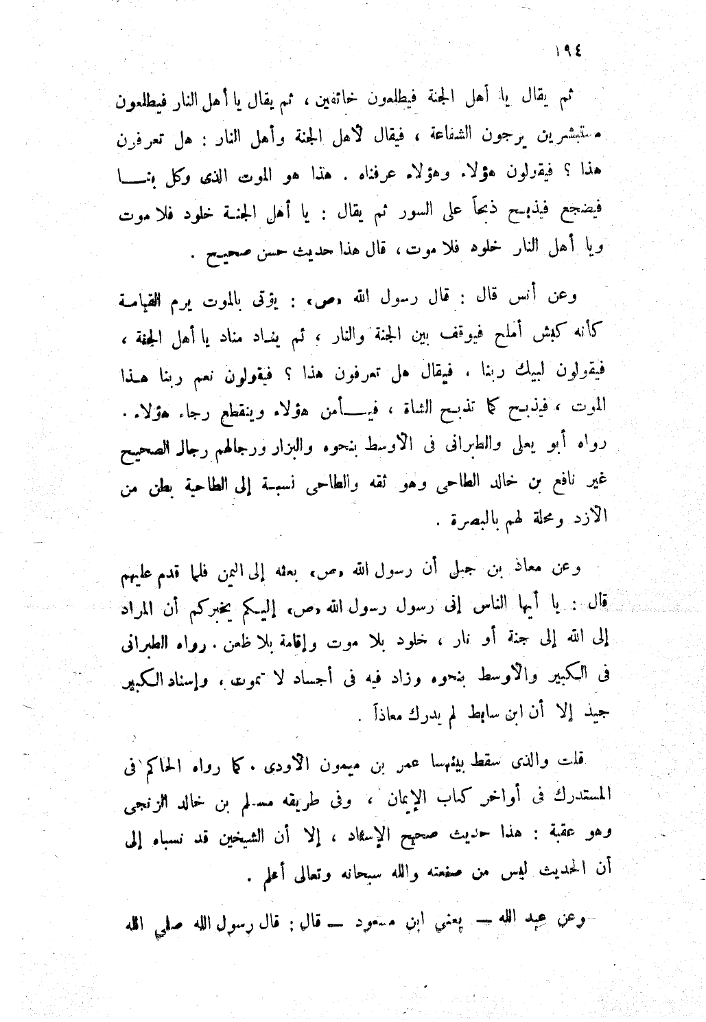 وَعَن أنس قَالَ قَالَ رَسُول الله صلى الله عَلَيْهِ وَسلم يُؤْتى بِالْمَوْتِ يَوْم الْقِيَامَة كَأَنَّهُ كَبْش أَمْلَح فَيُوقف بَين الْجنَّة وَالنَّار ثمَّ يناد مُنَاد يَا أهل الْجنَّة فَيَقُولُونَ لبيْك رَبنَا فَيُقَال هَل تعرفُون هَذَا فَيَقُولُونَ نعم رَبنَا هَذَا الْمَوْت فَيذْبَح كَمَا تذبح الشَّاة فَيَأْمَن هَؤُلَاءِ وَيَنْقَطِع رَجَاء هَؤُلَاءِ رَوَاهُ أَبُو يعلى والطبرانى فى الْأَوْسَط بِنَحْوِهِ وَالْبَزَّار ورجالهم رجال الصَّحِيح غير نَافِع بن خَالِد الطاحى وَهُوَ ثِقَة والطاحى نِسْبَة إِلَى الطاحية بطن من الأزد ومحلة لَهُم بِالْبَصْرَةِ