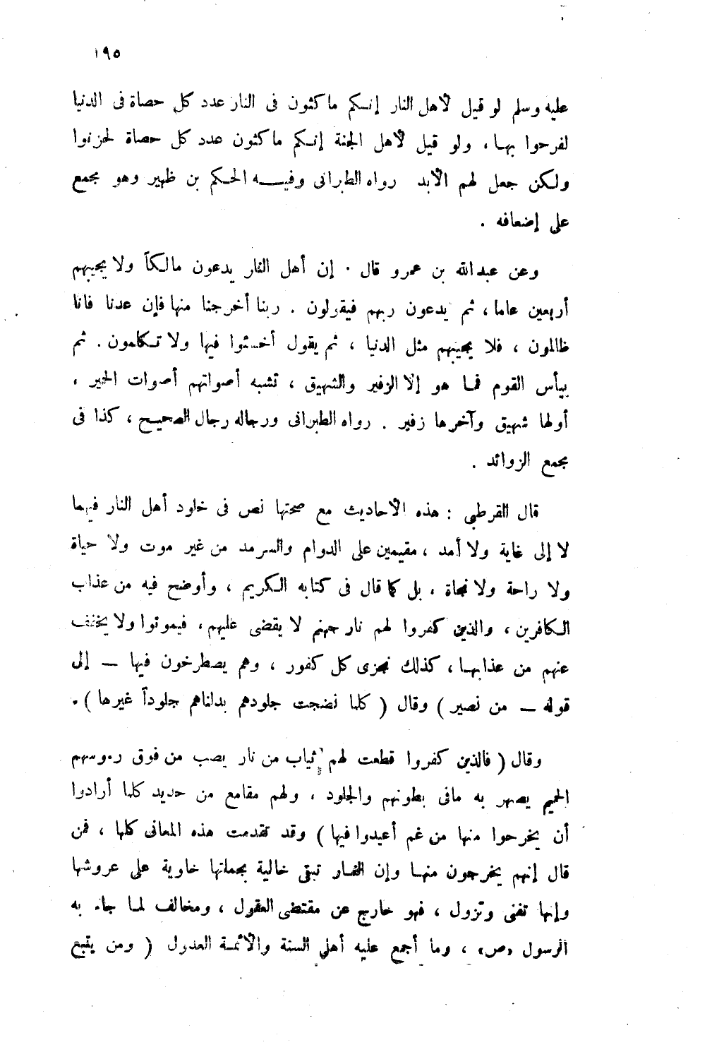 قَالَ القرطبى هَذِه الْأَحَادِيث مَعَ صِحَّتهَا نَص فى خُلُود أهل النَّار فيهمَا لَا إِلَى غَايَة وَلَا أمد مقيمين على الدَّوَام والسرمد من غير موت وَلَا حَيَاة وَلَا رَاحَة وَلَا نجاة بل كَمَا قَالَ فى كِتَابه الْكَرِيم وأوضح فِيهِ من عَذَاب الْكَافرين {وَالَّذين كفرُوا لَهُم نَار جَهَنَّم لَا يقْضى عَلَيْهِم فيموتوا وَلَا يُخَفف عَنْهُم من عَذَابهَا كَذَلِك نجزي كل كفور وهم يصطرخون فِيهَا} إِلَى قَوْله {من نصير} وَقَالَ {كلما نَضِجَتْ جُلُودهمْ بَدَّلْنَاهُمْ جُلُودًا غَيرهَا}