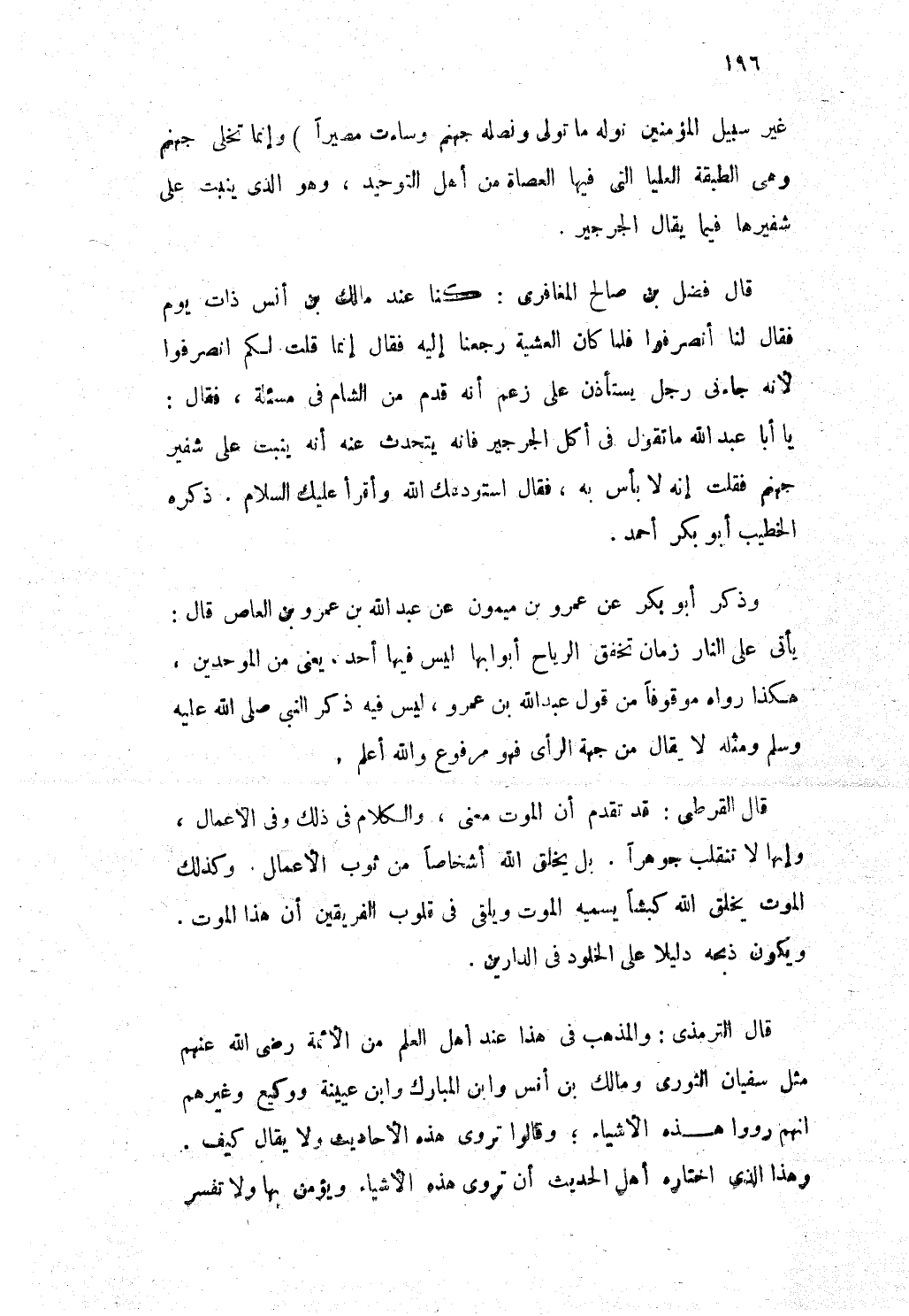 قَالَ القرطبى قد تقدم أَن الْمَوْت معنى وَالْكَلَام فى ذَلِك وفى الاعمال وَإِنَّهَا لَا تنْقَلب جوهرا بل يخلق الله أشخاصا من ثوب الْأَعْمَال وَكَذَلِكَ الْمَوْت يخلق الله كَبْشًا يُسَمِّيه الْمَوْت ويلقى فى قُلُوب الْفَرِيقَيْنِ أَن هَذَا الْمَوْت وَيكون ذبحه دَلِيلا على الخلود فى الدَّاريْنِ