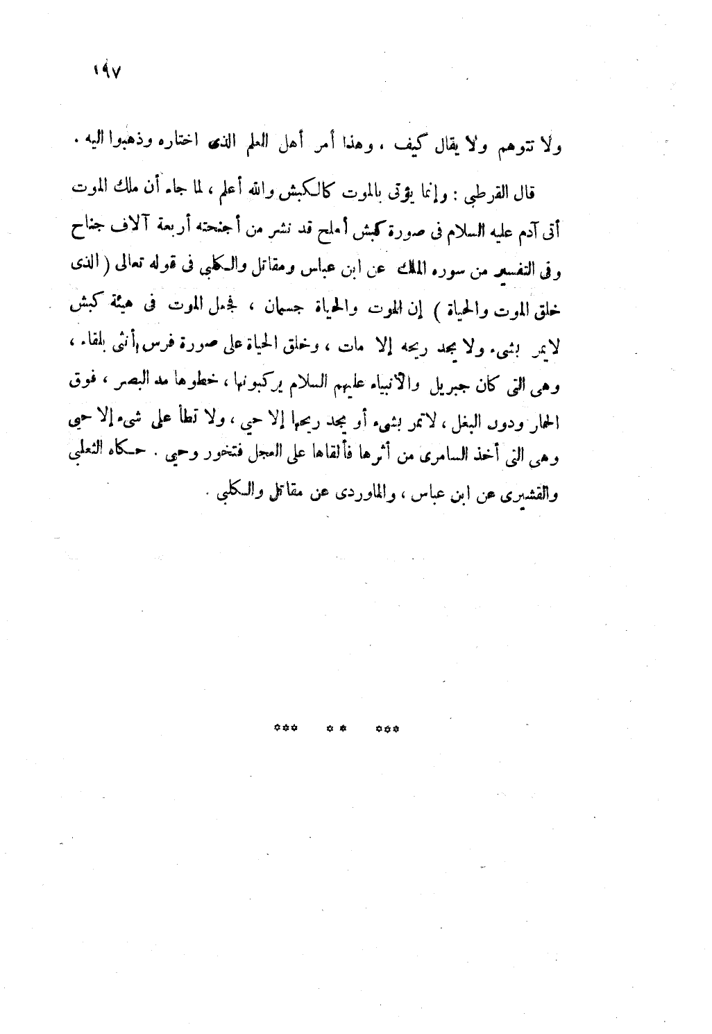 قَالَ القرطبى وَإِنَّمَا يُؤْتى بِالْمَوْتِ كالكبش وَالله أعلم لما جَاءَ أَن ملك الْمَوْت أَتَى آدم عَلَيْهِ السَّلَام فى صُورَة كَبْش أَمْلَح قد نشر من أجنحتة اربعة آلَاف جنَاح وفى التَّفْسِير من سُورَة الْملك عَن ابْن عَبَّاس وَمُقَاتِل والكلبى فى قَوْله تَعَالَى {الَّذِي خلق الْمَوْت والحياة} إِن الْمَوْت والحياه جسمان فَجعل الْمَوْت فى هَيْئَة كَبْش لَا يمر بشىء وَلَا يجد رِيحه إِلَّا مَاتَ وَخلق الْحَيَاة على صُورَة فرس أُنْثَى بلقاء وهى الَّتِى كَانَ جِبْرِيل والأنبياء عَلَيْهِم السَّلَام يركبونها خطوها مد الْبَصَر فَوق الْحمار دون الْبَغْل لَا تمر بشىء أَن يجد رِيحهَا إِلَّا حيى وَلَا تطَأ على شىء إِلَّا حيى وهى الَّتِى أَخذ السامرى من أَثَرهَا فألقاها على الْعجل فتخور وحيى حَكَاهُ الثعلبى والقشيرى عَن ابْن عَبَّاس والماوردى عَن مقَاتل والكلبى