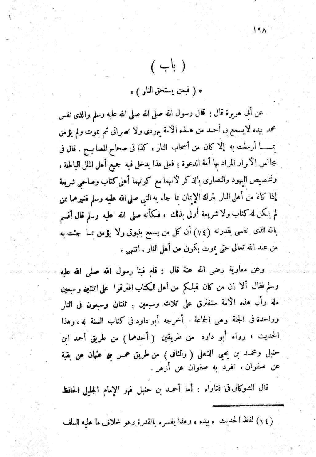 وَعَن مُعَاوِيَة رضى الله عَنهُ قَالَ قَامَ فِينَا رَسُول الله صلى الله عَلَيْهِ وَسلم فَقَالَ أَلا ان من كَانَ قبلكُمْ من أهل الْكتاب افْتَرَقُوا على اثْنَتَيْنِ وَسبعين مِلَّة وَأَن هَذِه الْأمة سَتَفْتَرِقُ على ثَلَاث وَسبعين ثِنْتَانِ وَسَبْعُونَ فى النَّار وَوَاحِدَة فى الْجنَّة وهى الْجَمَاعَة أخرجه أَبُو دَاوُد فى كتاب السّنة لَهُ وَهَذَا الحَدِيث رَوَاهُ أَبُو دَاوُد من طَرِيقين أَحدهمَا من طَرِيق أَحْمد ابْن حَنْبَل وَمُحَمّد بن يحيى الذهلى وَالثَّانِي من طَرِيق عمر بن عُثْمَان عَن بَقِيَّة عَن صَفْوَان تفرد بِهِ صَفْوَان عَن أَزْهَر