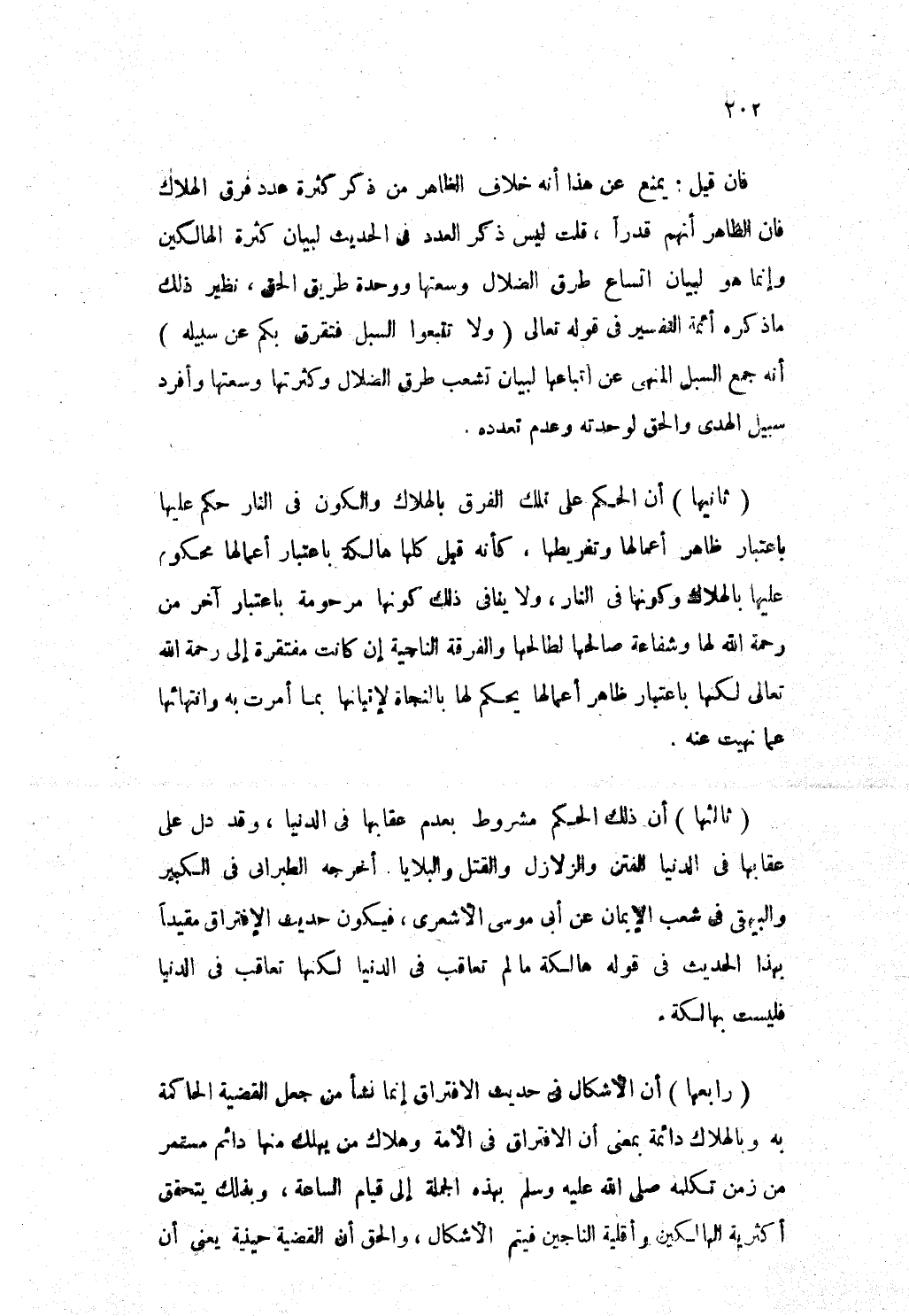 رَابِعهَا أَن الأشكال فى حَدِيث الِافْتِرَاق إِنَّمَا نَشأ من جعل الْقَضِيَّة الحاكمة بِهِ وبالهلاك دائمة بِمَعْنى أَن الِافْتِرَاق فى الْأمة وهلاك من يهْلك مِنْهَا دَائِم مُسْتَمر من زمن تكَلمه صلى الله عَلَيْهِ وَسلم بِهَذِهِ الْجُمْلَة إِلَى قيام السَّاعَة وَبِذَلِك يتَحَقَّق أكثرية الهالكين وأقلية الناجين فَيتم الْإِشْكَال وَالْحق أَن الْقَضِيَّة حينية يَعْنِي أَن