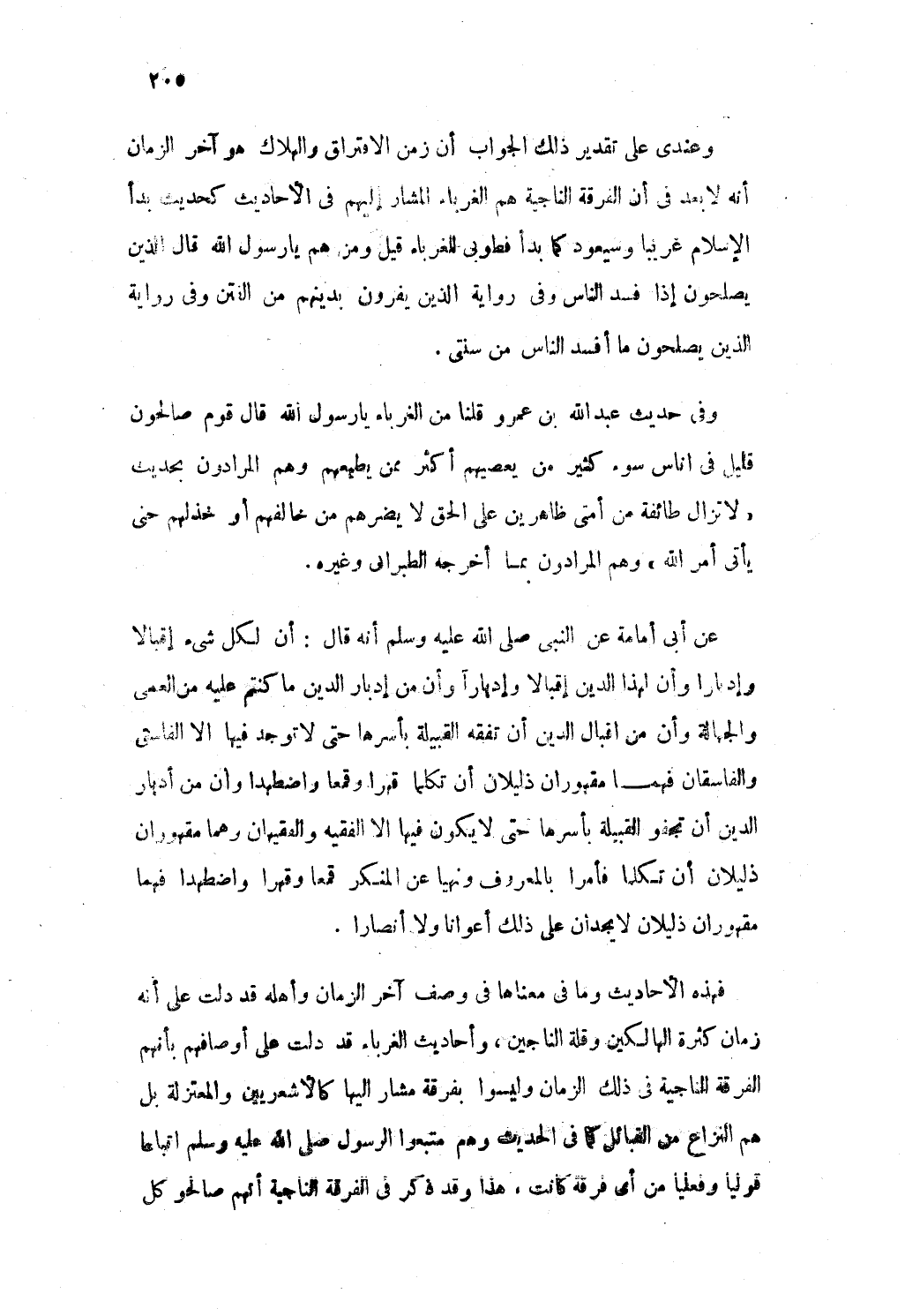 فَهَذِهِ الْأَحَادِيث وَمَا فى مَعْنَاهَا فى وصف آخر الزَّمَان وَأَهله قد دلّت على أَنه زمَان كَثْرَة الهالكين وَقلة الناجين وَأَحَادِيث الغرباء قد دلّت على أوصافهم بِأَنَّهُم الْفرْقَة النَّاجِية فى ذَلِك الزَّمَان وَلَيْسوا بفرقة مشار إِلَيْهَا كالأشعريين والمعتزلة بل هم النزاع من الْقَبَائِل كَمَا فى الحَدِيث وهم متبعوا الرَّسُول صلى الله عَلَيْهِ وَسلم اتبَاعا قوليا وفعليا من أى فرقة كَانَت هَذَا وَقد ذكر فى الْفرْقَة النَّاجِية أَنهم صالحو كل
