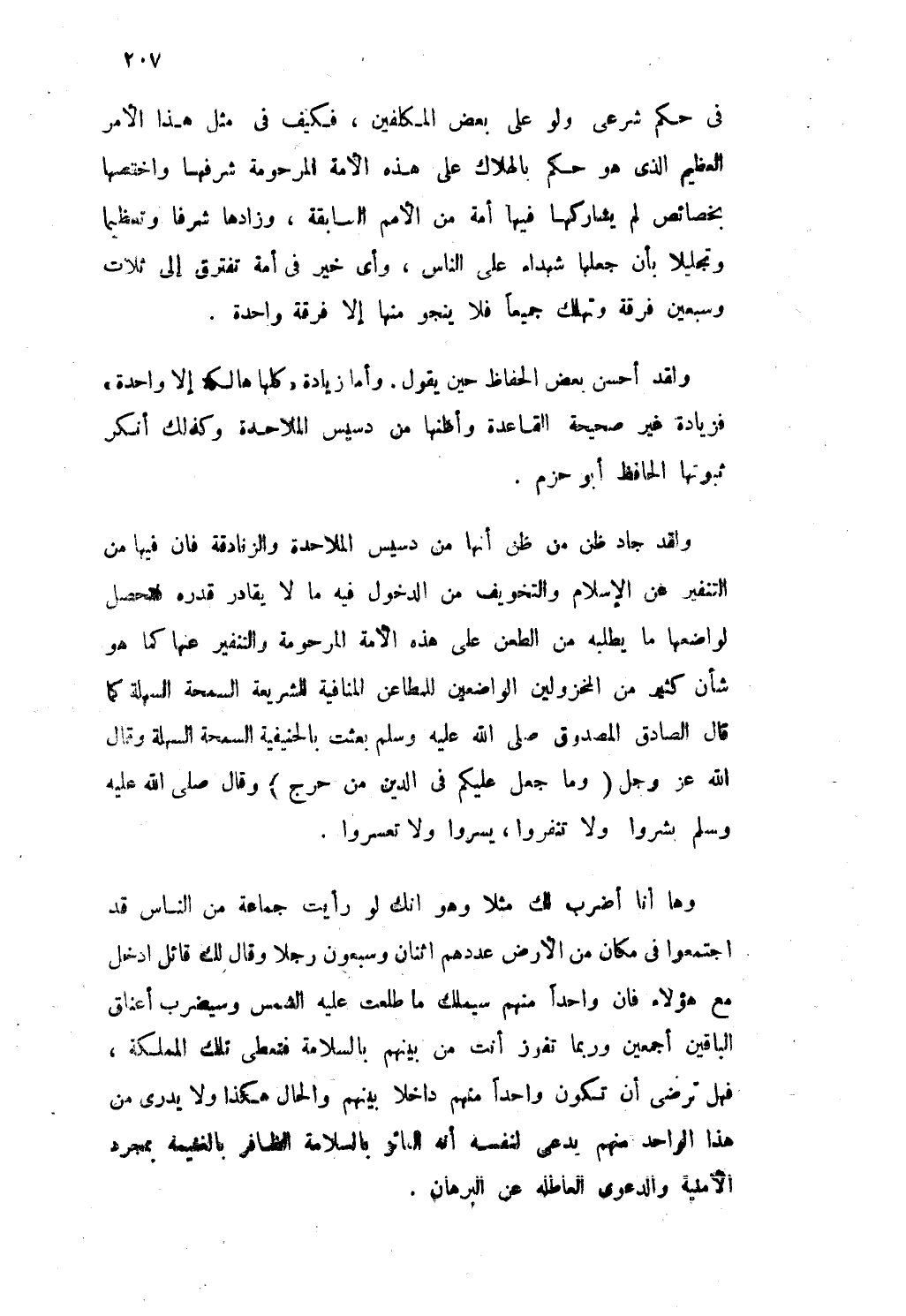 فى حكم شَرْعِي وَلَو على بعض الْمُكَلّفين فَكيف فى مثل هَذَا الْأَمر الْعَظِيم الذى هُوَ حكم بِالْهَلَاكِ على هَذِه الْأمة المرحومة شرفها واختصها بخصائص لم يشاركها فِيهَا أمة من الْأُمَم السَّابِقَة وزادها شرفا وتعظيما وتجليلا بِأَن جعلهَا شُهَدَاء على النَّاس وأى خير فى أمة تفترق إِلَى ثَلَاث وَسبعين فرقة وتهلك جَمِيعًا فَلَا ينجو مِنْهَا إِلَّا فرقة وَاحِدَة