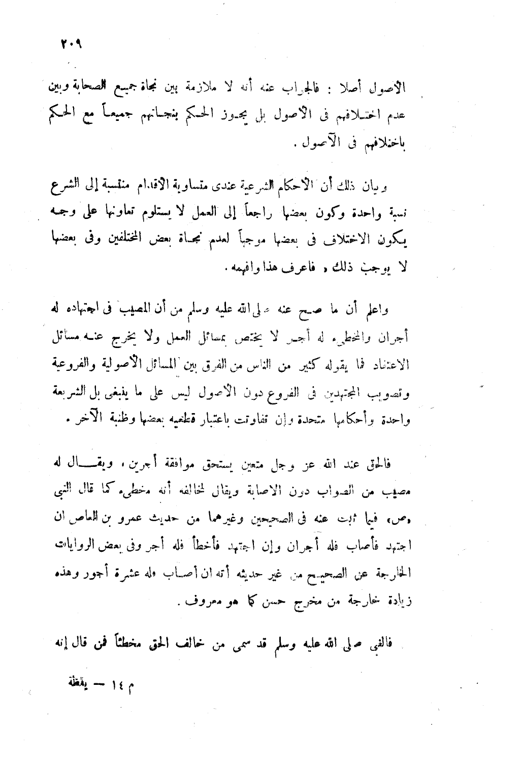 وَبَيَان ذَلِك أَن الْأَحْكَام الشَّرْعِيَّة عندى مُتَسَاوِيَة الْأَقْدَام منتسبة إِلَى الشَّرْع نِسْبَة وَاحِدَة وَكَون بَعْضهَا رَاجعا إِلَى الْعَمَل لَا يستلوم تعاونها على وَجه يكون الإختلاف فى بَعْضهَا مُوجبا لعدم نجاة بعض الْمُخْتَلِفين وفى بَعْضهَا لَا يُوجب ذَلِك فاعرف هَذَا وأفهمه