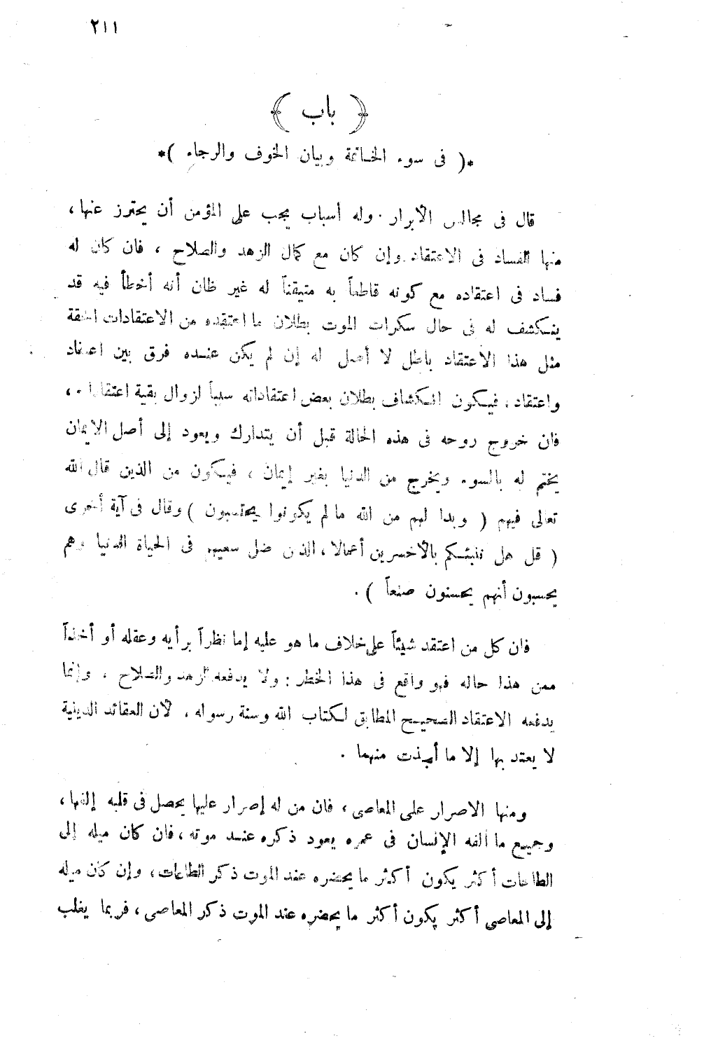 قَالَ فى مجَالِس الْأَبْرَار وَله أَسبَاب يجب على الْمُؤمن أَن يحْتَرز عَنْهَا مِنْهَا الْفساد فى الِاعْتِقَاد وَإِن كَانَ مَعَ كَمَال الزّهْد وَالصَّلَاح فان كَانَ لَهُ فَسَاد فى اعْتِقَاده مَعَ كَونه قَاطعا بِهِ متيقنا لَهُ غير ظان أَنه أَخطَأ فِيهِ قد ينْكَشف لَهُ فى حَال سَكَرَات الْمَوْت بطلَان مَا اعتقده من الاعتقادات الحقة مثل هَذَا الِاعْتِقَاد بَاطِل لَا أصل لَهُ إِن لم يكن عِنْده فرق بَين اعْتِقَاد واعتقاد فَيكون انكشاف بطلَان بعض اعتقاداته سَببا لزوَال بَقِيَّة اعتقاداته فان خُرُوج روحه فى هَذِه الْحَالة قبل أَن يتدارك وَيعود إِلَى أصل الايمان يخْتم لَهُ بالسوء وَيخرج من الدُّنْيَا بِغَيْر إِيمَان فَيكون من الَّذين قَالَ الله تَعَالَى فيهم وبدا لَهُم من الله مالم يَكُونُوا يحتسبون وَقَالَ فى آيَة أُخْرَى قل هَل ننبئكم بالاخسرين أعمالا الَّذين ضل سَعْيهمْ فى الْحَيَاة الدُّنْيَا وهم يحسبون أَنهم يحسنون صنعا