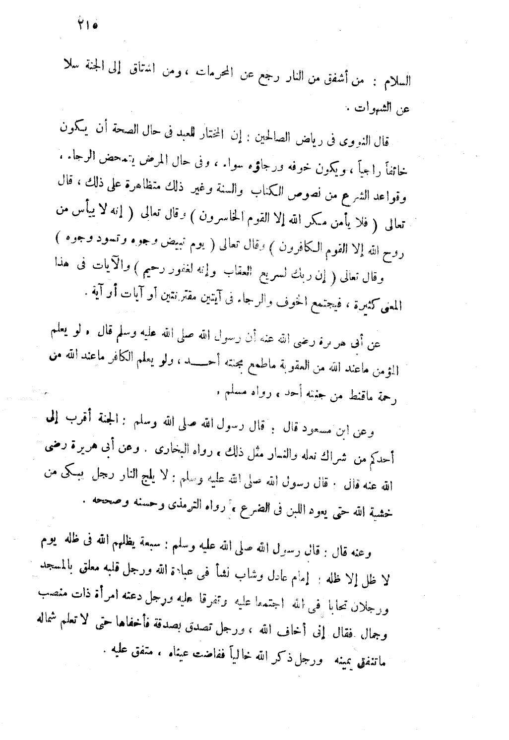 قَالَ النووى فى رياض الصَّالِحين إِن الْمُخْتَار للْعَبد فى حَال الصِّحَّة أَن يكون خَائفًا راجيا وَيكون خَوفه ورجاؤه سَوَاء وفى حَال الْمَرَض يتمحض الرَّجَاء وقواعد الشَّرْع من نُصُوص الْكتاب وَالسّنة وَغير ذَلِك متظاهرة على ذَلِك قَالَ تَعَالَى فَلَا يَأْمَن مكر الله إِلَّا الْقَوْم الخاسرون وَقَالَ تَعَالَى إِنَّه لَا ييأس من روح الله الا الْقَوْم الْكَافِرُونَ وَقَالَ تَعَالَى يَوْم تبيض وُجُوه وَتسود وُجُوه وَقَالَ تَعَالَى إِن رَبك لسريع الْعقَاب وَإنَّهُ لغَفُور رَحِيم والآيات فى هَذَا الْمَعْنى كَثِيرَة فيجتمع الْخَوْف والرجاء فى آيَتَيْنِ مقترنتين أَو أيات أَو آيَة