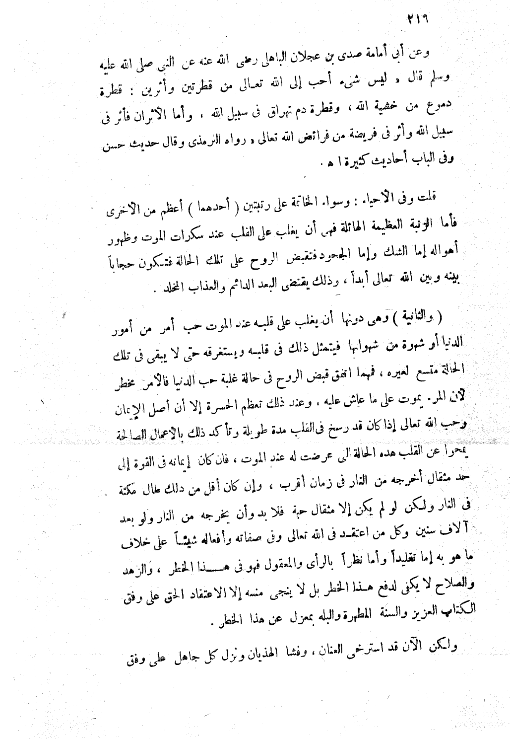 وَعَن أَبى أُمَامَة صدى بن عجلَان الباهلى رَضِي الله عَنهُ عَن النبى صلى الله عَلَيْهِ وَسلم قَالَ لَيْسَ شىء أحب إِلَى الله تَعَالَى من قطرتين واثرين قَطْرَة دموع من خشيَة الله وقطرة دم تهراق فى سَبِيل الله وَأما الأثران فأثر فى سَبِيل الله وَأثر فى فَرِيضَة من فَرَائض الله تَعَالَى رَوَاهُ الترمذى وَقَالَ حَدِيث حسن وفى الْبَاب أَحَادِيث كَثِيرَة