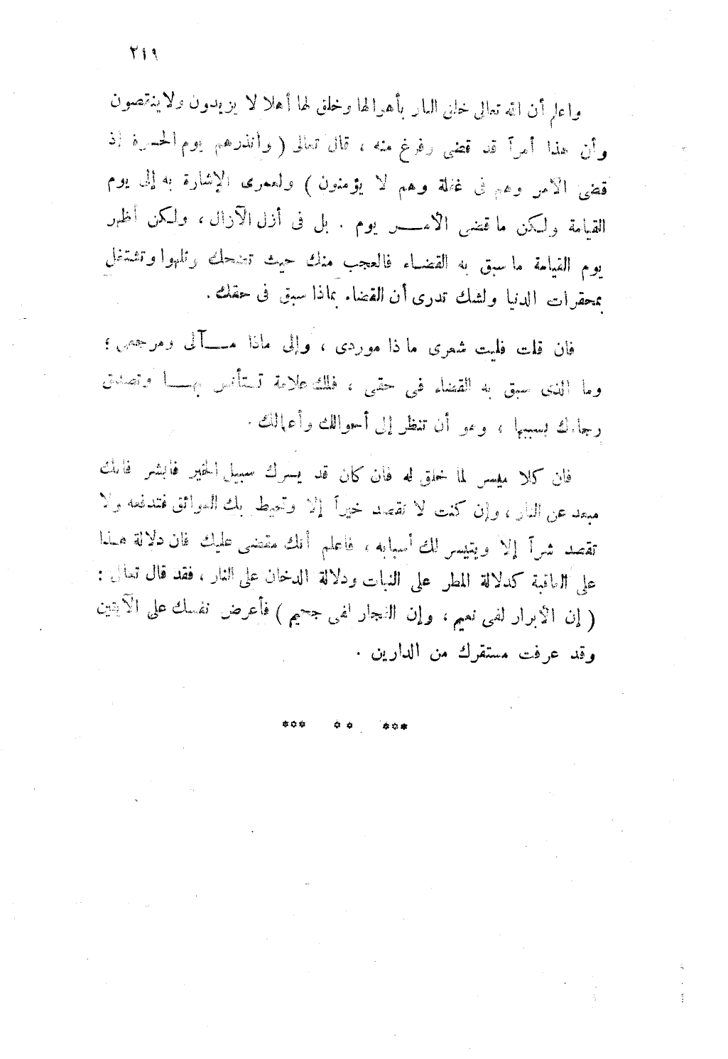 وَاعْلَم أَن الله تَعَالَى خلق النَّار بأهوالها وَخلق لَهَا أَهلا لَا يزِيدُونَ وَلَا ينقصُونَ وَأَن هَذَا أمرا قد قضى وَفرغ مِنْهُ قَالَ تَعَالَى وَأَنْذرهُمْ يَوْم الْحَسْرَة إِذْ قضى الْأَمر وهم فى غَفلَة وهم لَا يُؤمنُونَ ولعمرى الْإِشَارَة بِهِ إِلَى يَوْم الْقِيَامَة وَلَكِن مَا قضى الْأَمر يَوْم بل فى أزل الآزال وَلَكِن أظهر يَوْم الْقِيَامَة مَا سبق بِهِ الْقَضَاء فالعجب مِنْك حَيْثُ تضحك وتلهوا وتشتغل بمحقرات الدُّنْيَا ولشك تَدْرِي أَن الْقَضَاء بِمَاذَا سبق فى حَقك