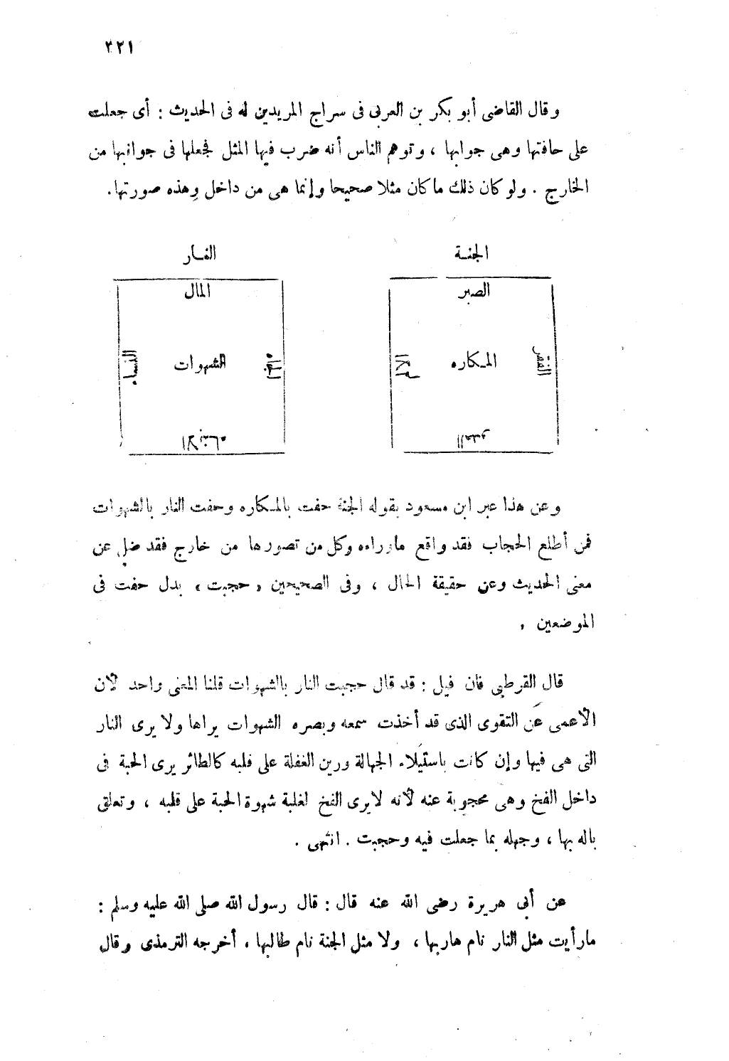 وَعَن هَذَا عبر ابْن مَسْعُود بقوله الْجنَّة حفت بالمكاره وحفت النَّار بالشهوات فَمن اطلع الْحجاب فقد وَاقع مَا وَرَاءه وكل من تصورها من خَارج فقد ضل عَن معنى الحَدِيث وَعَن حَقِيقَة الْحَال وفى الصَّحِيحَيْنِ وحجبت بدل حفت فى الْمَوْضِعَيْنِ