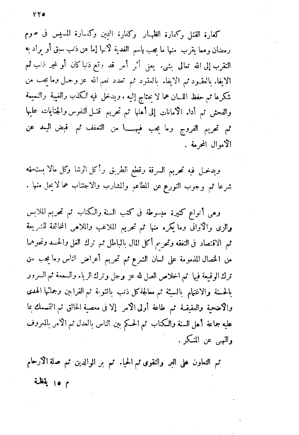 وَهِي أَنْوَاع كَثِيرَة مبسوطة فى كتب السّنة وَالْكتاب ثمَّ تَحْرِيم الملابس والزى والأوانى وَمَا يكره مِنْهَا ثمَّ تَحْرِيم الملاعب والملاهي الْمُخَالفَة للشريعة ثمَّ الاقتصاد فى النَّفَقَة وَتَحْرِيم أكل المَال بِالْبَاطِلِ ثمَّ ترك الغل والحسد وَنَحْوهمَا من الْخِصَال المذمومة على لِسَان الشَّرْع ثمَّ تَحْرِيم أَعْرَاض النَّاس وَمَا يجب من ترك الوقيعة فِيهَا ثمَّ اخلاص الْعَمَل لله عز وَجل وَترك الرِّيَاء والسمعة ثمَّ السرُور بِالْحَسَنَة والاغتمام بِالسَّيِّئَةِ ثمَّ معالجة كل ذَنْب بِالتَّوْبَةِ ثمَّ القرابين وجملتها الْهدى والاضحية والعقيقة ثمَّ طَاعَة أولى الْأَمر إِلَّا فِي مَعْصِيّة الْخَالِق ثمَّ التَّمَسُّك بِمَا عَلَيْهِ جمَاعَة أهل السّنة وَالْكتاب ثمَّ الحكم بَين النَّاس بِالْعَدْلِ ثمَّ الْأَمر بِالْمَعْرُوفِ وَالنَّهْي عَن الْمُنكر