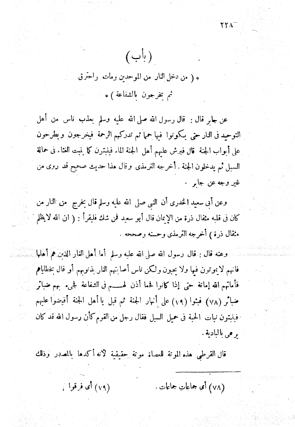 عَن جَابر قَالَ قَالَ رَسُول الله صلى الله عَلَيْهِ وَسلم يعذب نَاس من أهل التَّوْحِيد فى النَّار حَتَّى يَكُونُوا فِيهَا حمما ثمَّ تُدْرِكهُمْ الرَّحْمَة فَيخْرجُونَ ويطرحون على أَبْوَاب الْجنَّة قَالَ فيرش عَلَيْهِم أهل الْجنَّة المَاء فينبتون كَمَا ينْبت الغثاء فى حمالَة السَّيْل ثمَّ يدْخلُونَ الْجنَّة أخرجه الترمذى وَقَالَ هَذَا حَدِيث صَحِيح قد روى من غير وَجه عَن جَابر