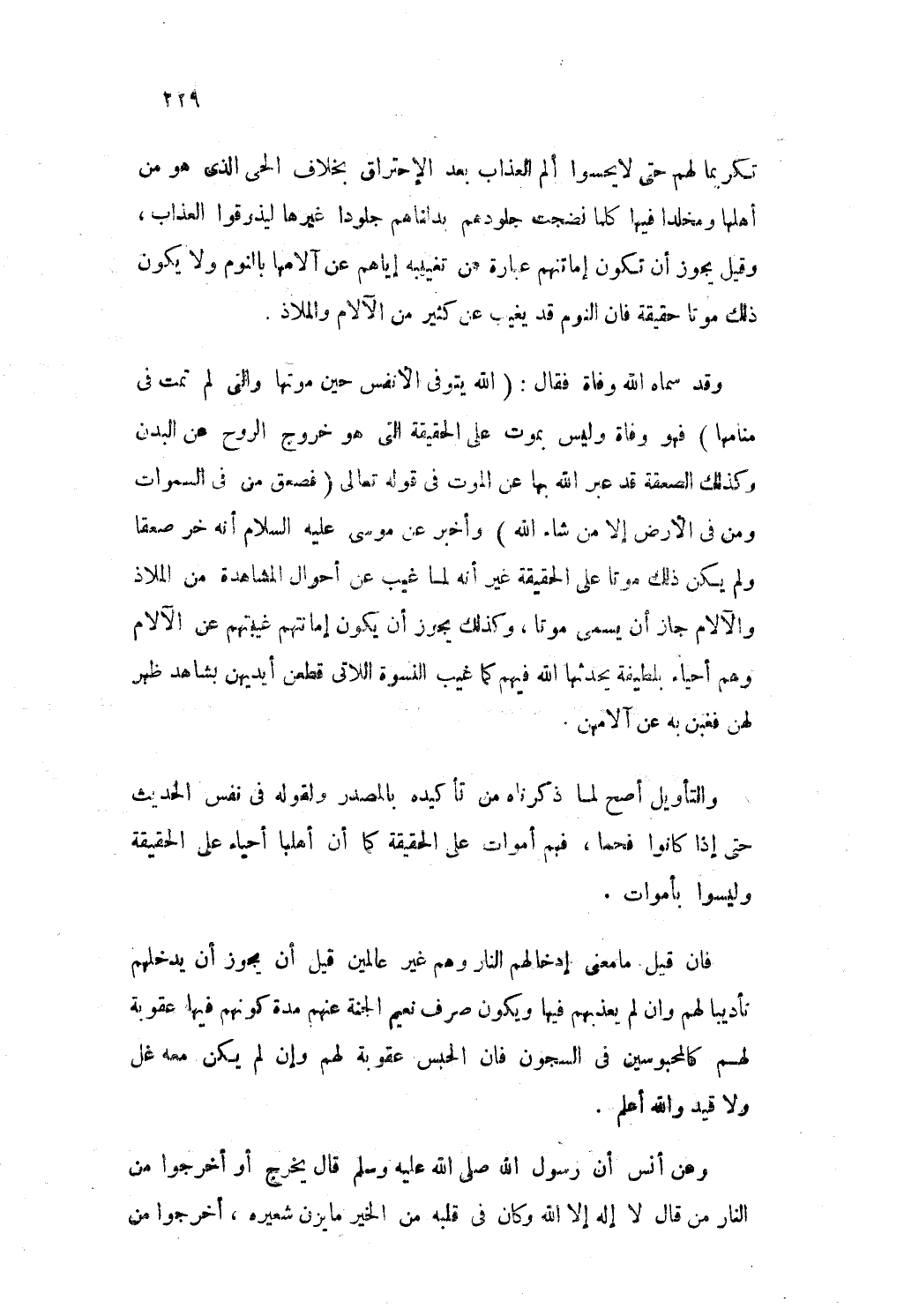 وَقد سَمَّاهُ الله وَفَاة فَقَالَ الله يتوفى الْأَنْفس حِين مَوتهَا والتى لم تمت فى منامها فَهُوَ وَفَاة وَلَيْسَ بِمَوْت على الْحَقِيقَة الَّتِى هُوَ خُرُوج الرّوح عَن الْبدن وَكَذَلِكَ الصعقة قد عبر الله بهَا عَن الْمَوْت فى قَوْله تَعَالَى فَصعِقَ من فى السَّمَوَات وَمن فى الأَرْض إِلَّا من شَاءَ الله وَأخْبر عَن مُوسَى عَلَيْهِ السَّلَام أَنه خر صعقا وَلم يكن ذَلِك موتا على الْحَقِيقَة غير أَنه لما غيب عَن أَحْوَال الْمُشَاهدَة من الملاذ والآلام جَازَ أَن يُسمى موتا وَكَذَلِكَ يجوز أَن يكون إماتتهم غيبتهم عَن الآلام وهم أَحيَاء بلطيفة يحدثها الله فيهم كَمَا غيب النسْوَة اللاتى قطعن أَيْدِيهنَّ بِشَاهِد ظهر لَهُنَّ فغبن بِهِ عَن آلامهن