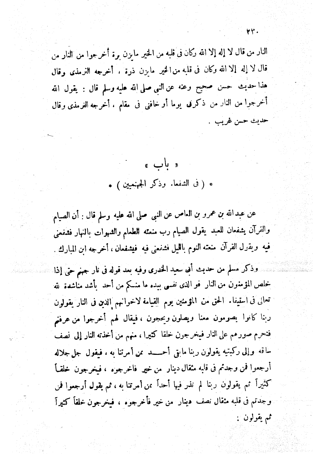 النَّار من قَالَ لَا إِلَه إِلَّا الله ركان فى قلبه من الْخَيْر مَا يزن بره أخرجُوا من النَّار من قَالَ لَا إِلَه إِلَّا الله وَكَانَ قلبه من الْخَيْر مَا يزن ذرة أخرجه الترمذى وَقَالَ هَذَا حَدِيث حسن صَحِيح وَعنهُ عَن النَّبِي صلى الله عَلَيْهِ وَسلم قَالَ يَقُول الله أخرجُوا من النَّار من ذَكرنِي يَوْمًا أَو خافني فى مقَام اخرجه الترمذى وَقَالَ حَدِيث حسن غَرِيب