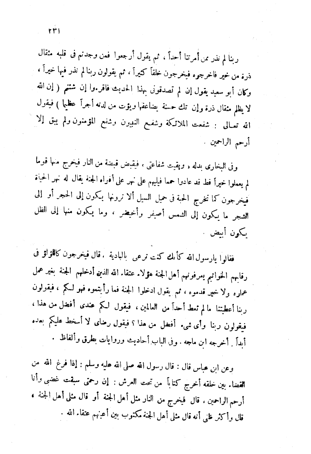 فَقَالُوا يَا رَسُول الله كَأَنَّك كنت ترعى بالبادية قَالَ فَيخْرجُونَ كَاللُّؤْلُؤِ فى رقابهم الخواتيم يعرفونهم أهل الْجنَّة هَؤُلَاءِ عُتَقَاء الله الَّذين أدخلهم الْجنَّة بِغَيْر عمل عملوه وَلَا خير قدموه ثمَّ يَقُول ادخُلُوا الْجنَّة فَمَا رَأَيْتُمُوهُ فَهُوَ لكم فَيَقُولُونَ رَبنَا أَعطيتنَا مالم تعط أحدا من الْعَالمين فَيَقُول لكم عندى أفضل من هَذَا فَيَقُول رَبنَا وأى شىء أفضل من هَذَا فَيَقُول رضاى لَا أَسخط عَلَيْكُم بعده أبدا اخرجه ابْن مَاجَه وفى الْبَاب أَحَادِيث وَرِوَايَات بطرق وألفاظ