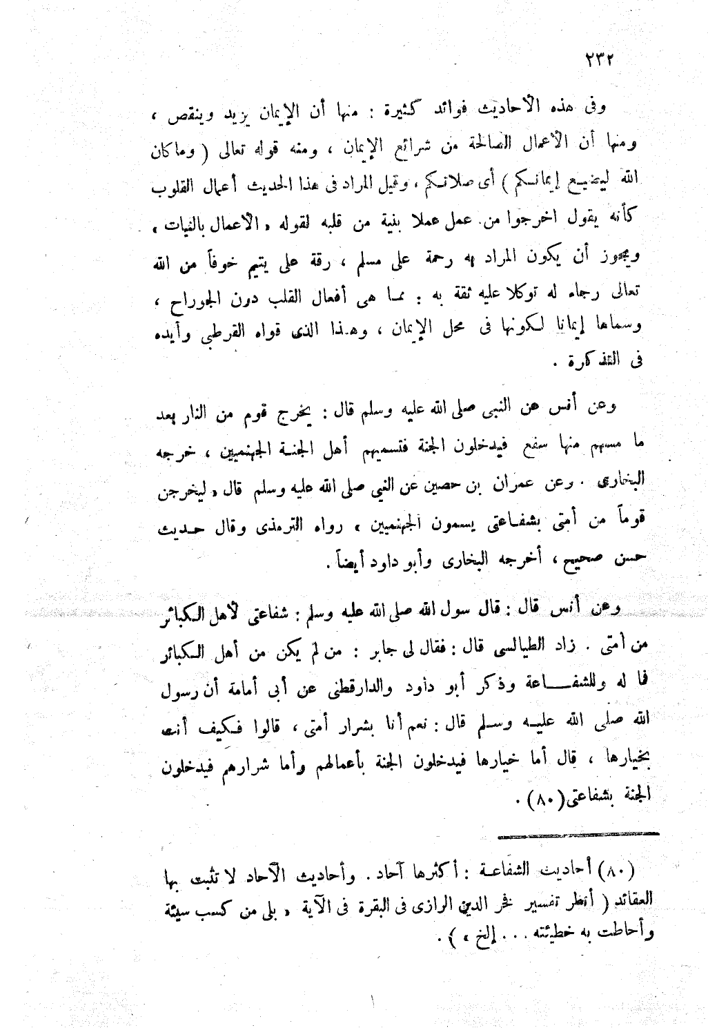 وفى هَذِه الْأَحَادِيث فَوَائِد كَثِيرَة مِنْهَا أَن الْإِيمَان يزِيد وَينْقص وَمِنْهَا أَن الْأَعْمَال الصَّالِحَة من شرائع الْإِيمَان وَمِنْه قَوْله تَعَالَى وَمَا كَانَ الله لِيُضيع إيمَانكُمْ أَي صَلَاتكُمْ وَقيل المُرَاد فِي هَذَا الحَدِيث أَعمال الْقُلُوب كَأَنَّهُ يَقُول اخْرُجُوا من عمل عملا بنية من قلبه لقَوْله الْأَعْمَال بِالنِّيَّاتِ وَيجوز أَن يكون المُرَاد بِهِ رَحْمَة على مُسلم رقة على يَتِيم خوفًا من الله تَعَالَى رَجَاء لَهُ توكلا عَلَيْهِ ثِقَة بِهِ مِمَّا هِيَ أَفعَال الْقلب دون الْجَوَارِح وسماها إِيمَانًا لكَونهَا فى مَحل الْإِيمَان وَهَذَا الذى قواه القرطبى وأيده فِي التَّذْكِرَة