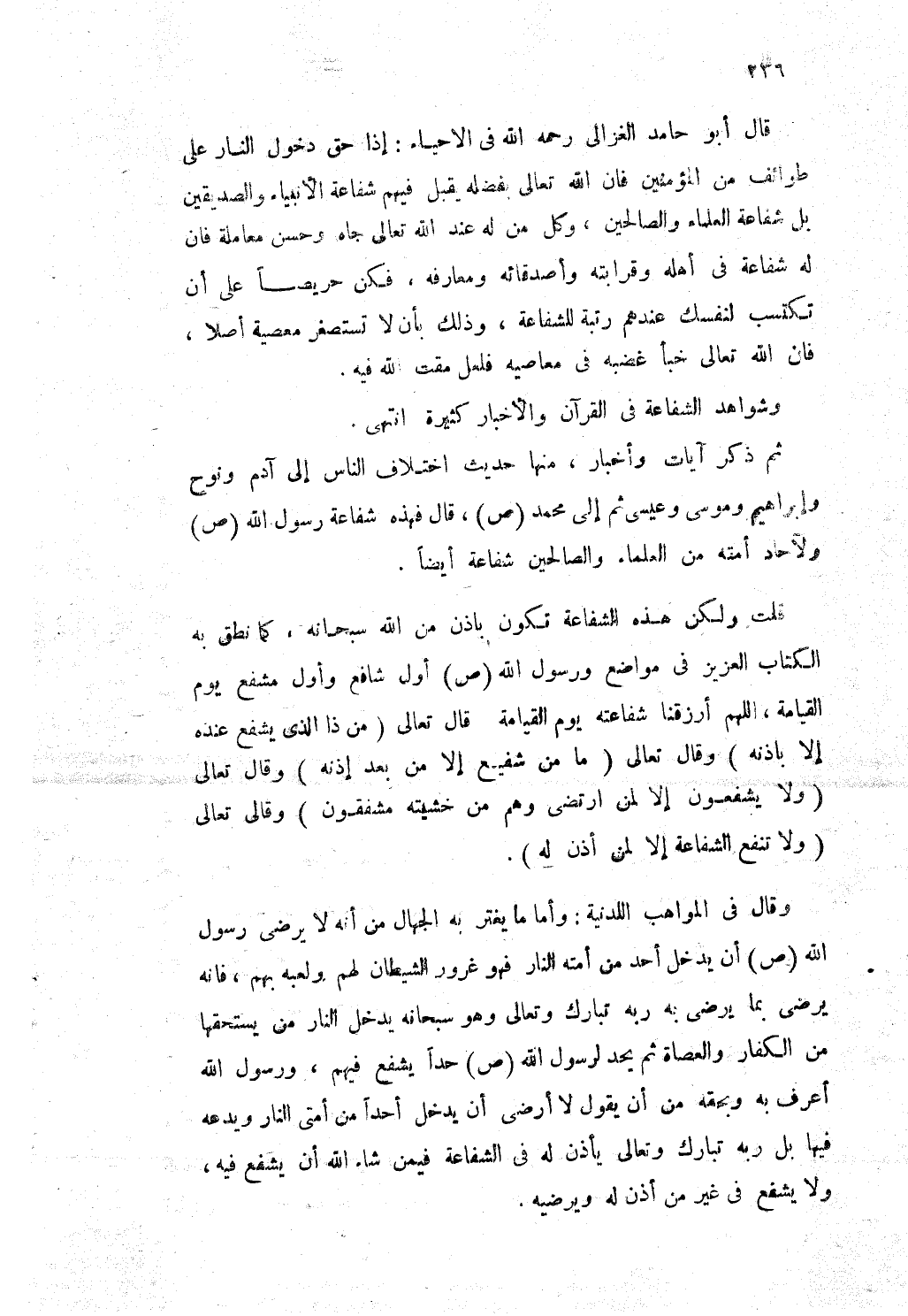 ثمَّ ذكر آيَات وأخبار مِنْهَا حَدِيث اخْتِلَاف النَّاس إِلَى آدم ونوح وَإِبْرَاهِيم ومُوسَى وَعِيسَى ثمَّ إِلَى مُحَمَّد صلى الله عَلَيْهِ وَسلم قَالَ فَهَذِهِ شَفَاعَة رَسُول الله صلى الله عَلَيْهِ وَسلم والأحاد أمته من الْعلمَاء وَالصَّالِحِينَ شَفَاعَة أَيْضا