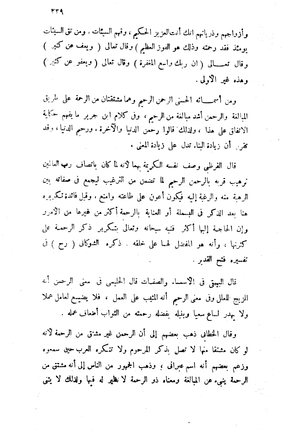 وَقَالَ الخطابى ذهب بَعضهم إِلَى أَن الرَّحْمَن غير مُشْتَقّ من الرَّحْمَة لِأَنَّهُ لَو كَانَ مشتقا مِنْهَا لاتصل بِذكر المرحوم وَلَا تنكره الْعَرَب حِين سَمِعُوهُ وَزعم بَعضهم أَنه اسْم عبرانى وَذهب الْجُمْهُور من النَّاس إِلَى أَنه مُشْتَقّ من الرَّحْمَة ينبىء عَن الْمُبَالغَة وَمَعْنَاهُ ذُو الرَّحْمَة لَا نَظِير لَهُ فِيهَا وَلذَلِك لَا يثنى