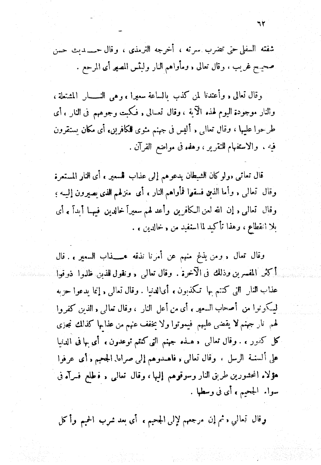 وَقَالَ تَعَالَى {وأعتدنا لمن كذب بالساعة سعيرا} وهى النَّار المشتعلة وَالنَّار مَوْجُودَة الْيَوْم لهَذِهِ الْآيَة وَقَالَ تَعَالَى {فكبت وُجُوههم فِي النَّار} أى طرحوا عَلَيْهَا وَقَالَ تَعَالَى {أَلَيْسَ فِي جَهَنَّم مثوى للْكَافِرِينَ} أى مَكَان يستقرون فِيهِ والاستفهام للتقرير وَهَذِه فى مَوَاضِع الْقُرْآن