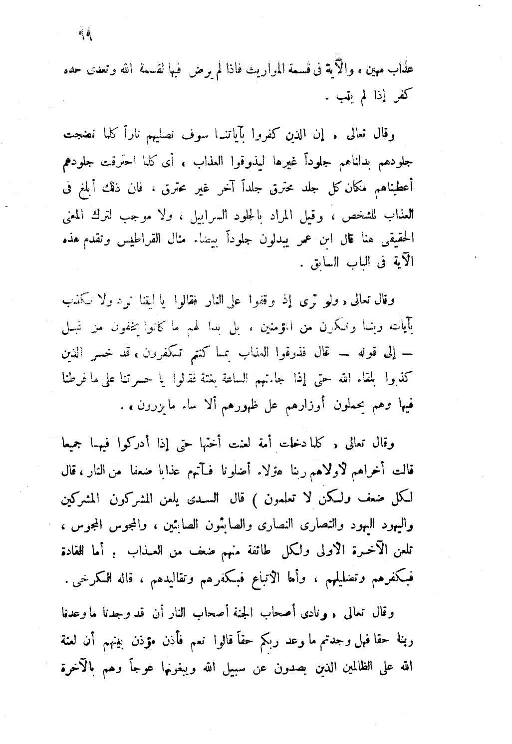 وَقَالَ تَعَالَى {إِن الَّذين كفرُوا بِآيَاتِنَا سَوف نصليهم نَارا كلما نَضِجَتْ جُلُودهمْ بَدَّلْنَاهُمْ جُلُودًا غَيرهَا ليذوقوا الْعَذَاب} أى كلما احترقت جُلُودهمْ أعطيناهم مَكَان كل جلد محترق جلدا آخر غير محترق فان ذَلِك أبلغ فى الْعَذَاب للشَّخْص وَقيل المُرَاد بالجلود السرابيل وَلَا مُوجب لترك الْمَعْنى الحقيقى هُنَا قَالَ ابْن عمر يبدلون جُلُودًا بَيْضَاء مِثَال الْقَرَاطِيس وَتقدم هَذِه الْآيَة فى الْبَاب السَّابِق