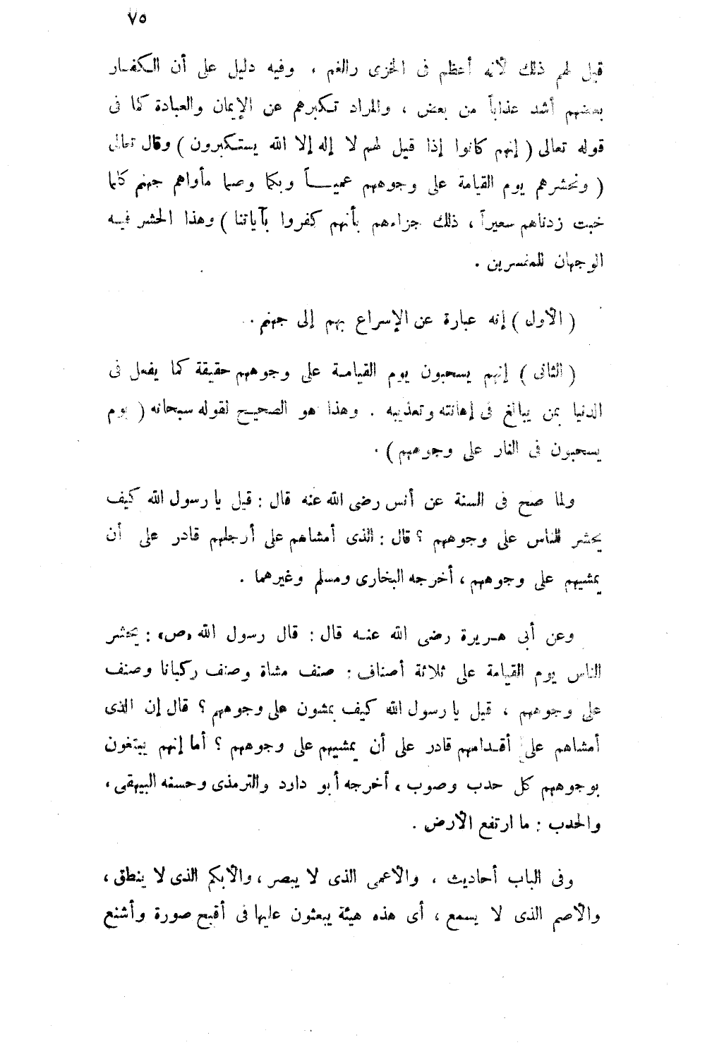 وَلما صَحَّ فى السّنة عَن أنس رضى الله عَنهُ قَالَ قيل يَا رَسُول الله كَيفَ يحْشر النَّاس على وُجُوههم قَالَ الذى أَمْشَاهُم على أَرجُلهم قَادر على أَن يُمشيهمْ على وُجُوههم أخرجه البخارى وَمُسلم وَغَيرهمَا