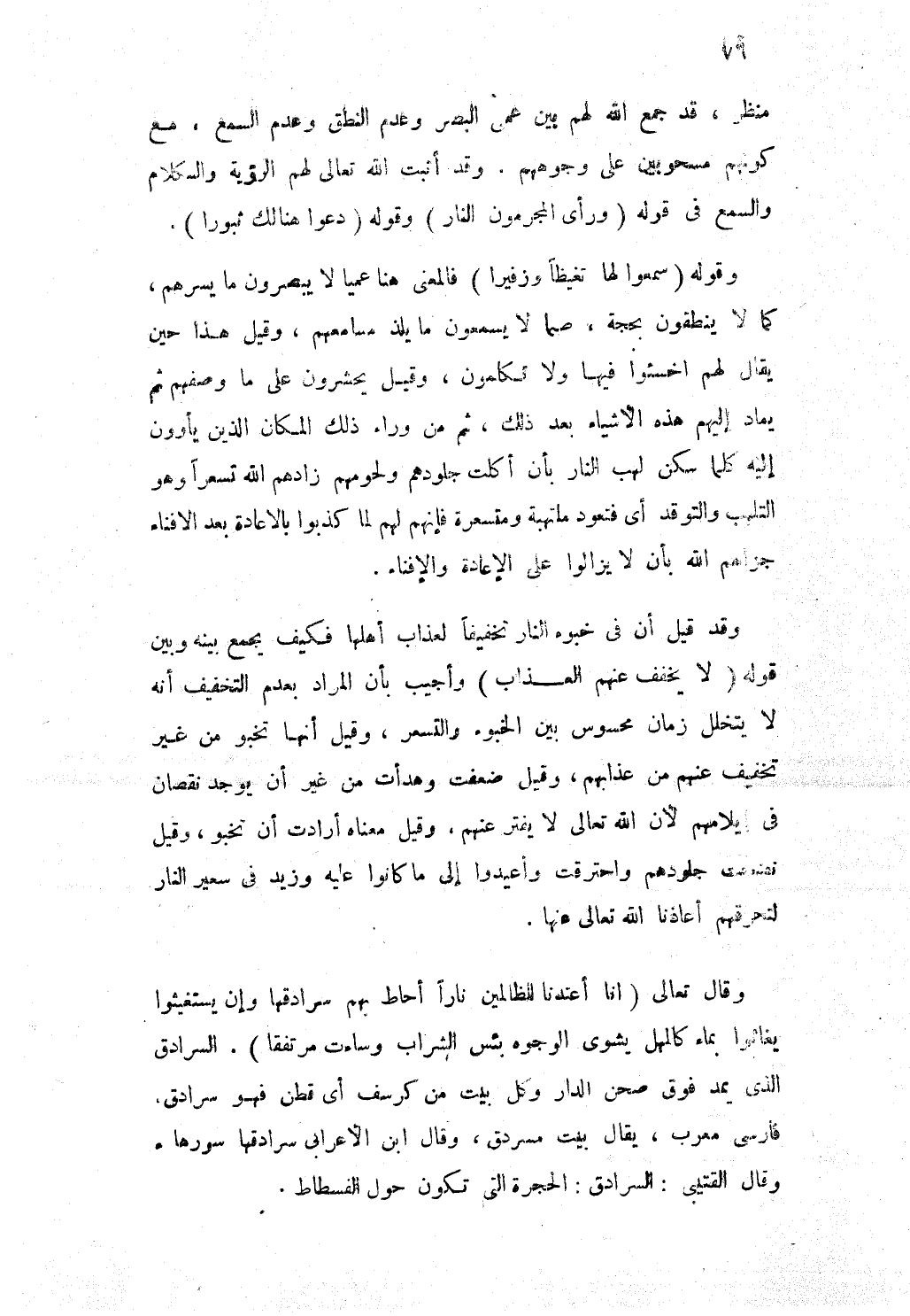 وَقَالَ تَعَالَى {إِنَّا أَعْتَدْنَا للظالمين نَارا أحَاط بهم سرادقها وَإِن يستغيثوا يغاثوا بِمَاء كَالْمهْلِ يشوي الْوُجُوه بئس الشَّرَاب وَسَاءَتْ مرتفقا} السرادق الذى يمد فَوق صحن الدَّار وكل بَيت من كُرْسُف أى قطن فَهُوَ سرادق فارسى مُعرب يُقَال بَيت مسردق وَقَالَ ابْن الأعرابى سرادقها سورها وَقَالَ القتيبى السرادق الْحُجْرَة الَّتِى تكون حول الْفسْطَاط