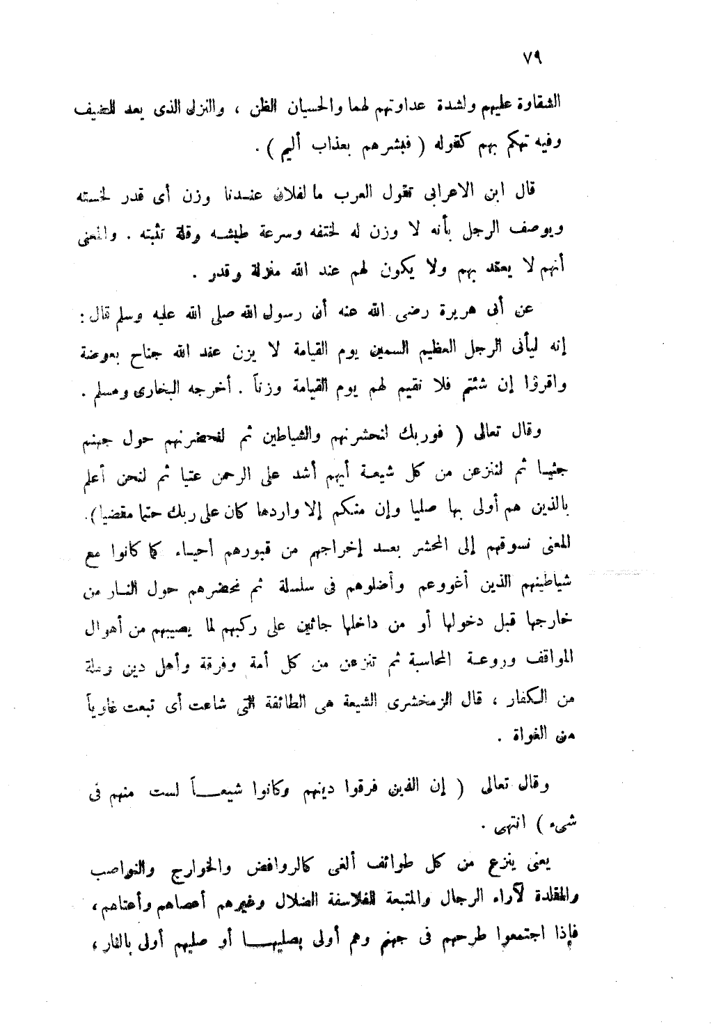 وَقَالَ تَعَالَى {فوربك لنحشرنهم وَالشَّيَاطِين ثمَّ لنحضرنهم حول جَهَنَّم جثيا ثمَّ لننزعن من كل شيعَة أَيهمْ أَشد على الرَّحْمَن عتيا ثمَّ لنَحْنُ أعلم بالذين هم أولى بهَا صليا وَإِن مِنْكُم إِلَّا واردها كَانَ على رَبك حتما مقضيا} الْمَعْنى نسوقهم إِلَى الْمَحْشَر بعد إخراجهم من قُبُورهم أَحيَاء كَمَا كَانُوا مَعَ شياطينهم الَّذين أغووهم وأضلوهم فى سلسلة ثمَّ نحضرهم حول النَّار من خَارِجهَا قبل دُخُولهَا أَو من داخلها جاثين على ركبهمْ لما يصيبهم من أهوال المواقف وروعة المحاسبة ثمَّ تنزعن من كل أمة وَفرْقَة وَأهل دين وملة من الْكفَّار قَالَ الزمخشرى الشِّيعَة هى الطَّائِفَة الَّتِى شاعت أى تبِعت غاويا من الغواة