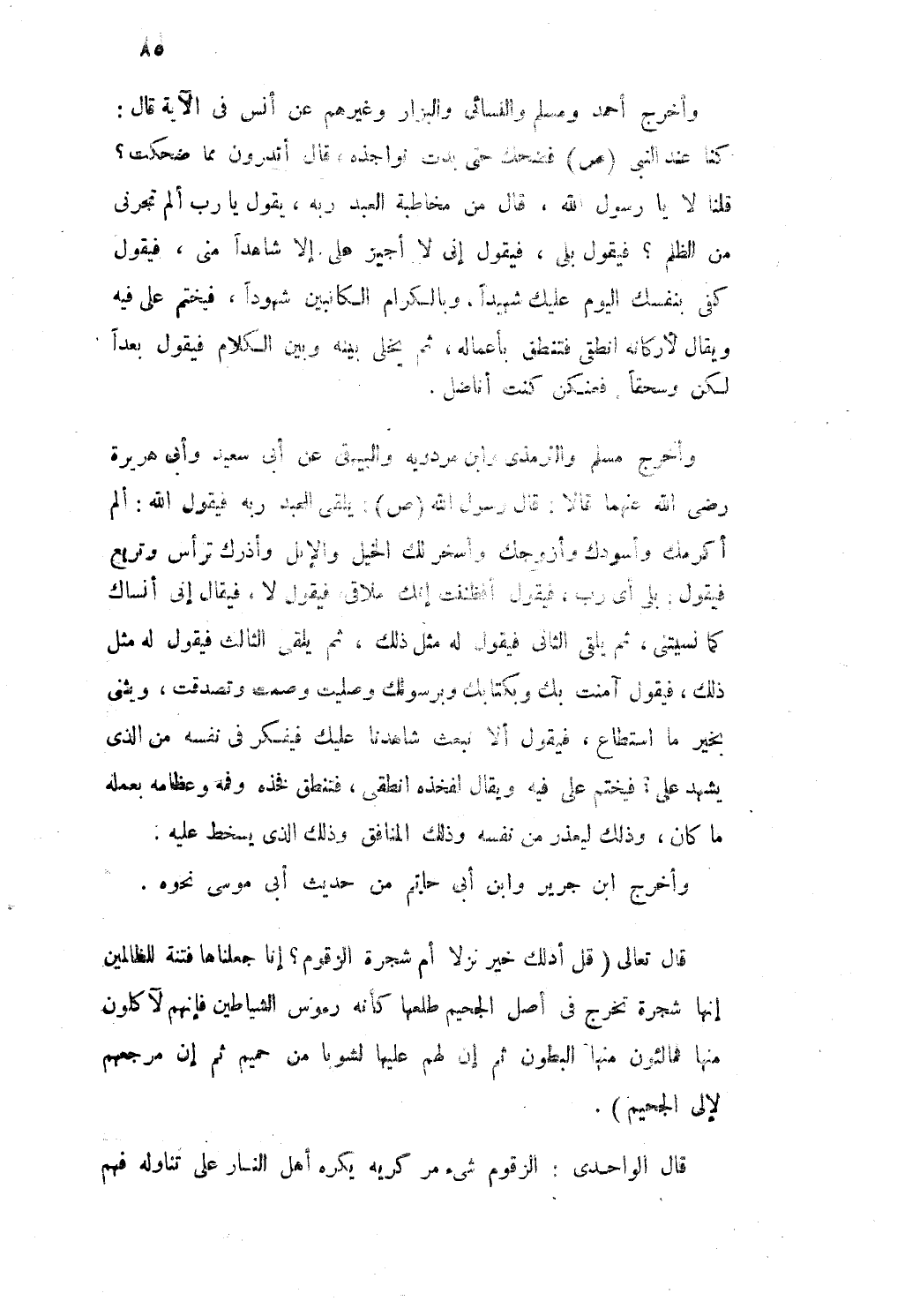 وَأخرج أَحْمد وَمُسلم والنسائى وَالْبَزَّار وَغَيرهم عَن أنس فى الْآيَة قَالَ كُنَّا عِنْد النبى ص فَضَحِك حَتَّى بَدَت نَوَاجِذه قَالَ أَتَدْرُونَ مِمَّا ضحِكت قُلْنَا لَا يَا رَسُول الله قَالَ من مُخَاطبَة العَبْد ربه يَقُول يَا رب ألم تجرنى من الظُّلم فَيَقُول بلَى فَيَقُول إنى لَا أُجِيز على إِلَّا شَاهدا منى فَيَقُول كفى بِنَفْسِك الْيَوْم عَلَيْك شَهِيدا وَبِالْكِرَامِ الْكَاتِبين شُهُودًا فيختم على فِيهِ وَيُقَال لِأَرْكَانِهِ انطقى فَتَنْطِق بِأَعْمَالِهِ ثمَّ يخلى بَينه وَبَين الْكَلَام فَيَقُول بعدا لَكِن وَسُحْقًا فَعَنْكُنَّ كنت أُنَاضِل