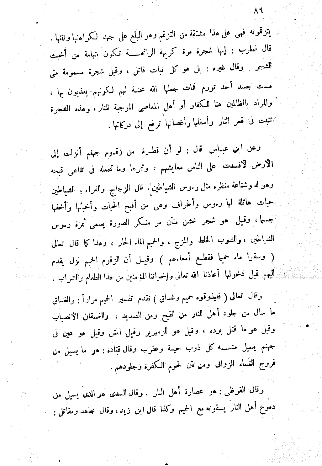 يتزقمونه فهى على هَذَا مُشْتَقَّة من التزقم وَهُوَ البلع على جهد لكراهتها ونتنها قَالَ قطرب إِنَّهَا شَجَرَة مرّة كريهة الرَّائِحَة تكون بتهامة من أَخبث الشّجر وَقَالَ غَيره بل هُوَ كل نَبَات قَاتل وَقيل شَجَرَة مَسْمُومَة مَتى مست جَسَد أحد تورم فَمَاتَ جعلهَا الله محنة لَهُم لكَوْنهم يُعَذبُونَ بهَا وَالْمرَاد الظَّالِمين هُنَا الْكفَّار أَو أهل المعاصى الْمُوجبَة للنار وَهَذِه الشَّجَرَة تنْبت فى قَعْر النَّار وأسفلها وَأَغْصَانهَا ترفع إِلَى دركاتها
