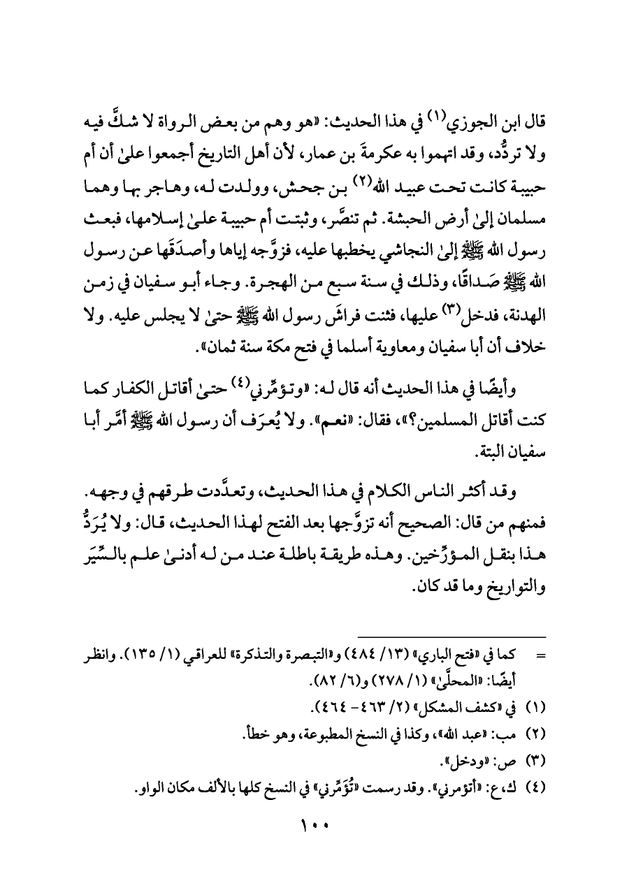 قال ابن الجوزي (¬١) في هذا الحديث: «هو وهم من بعض الرواة لا شكَّ فيه ولا تردُّد، وقد اتهموا به عكرمةَ بن عمار، لأن أهل التاريخ أجمعوا على أن أم حبيبة كانت تحت عبيد الله (¬٢) بن جحش، وولدت له، وهاجر بها وهما مسلمان إلى أرض الحبشة. ثم تنصَّر، وثبتت أم حبيبة على إسلامها، فبعث رسول الله - صلى الله عليه وسلم - إلى النجاشي يخطبها عليه، فزوَّجه إياها وأصدَقَها عن رسول الله - صلى الله عليه وسلم - صَداقًا، وذلك في سنة سبع من الهجرة. وجاء أبو سفيان في زمن الهدنة، فدخل (¬٣)
