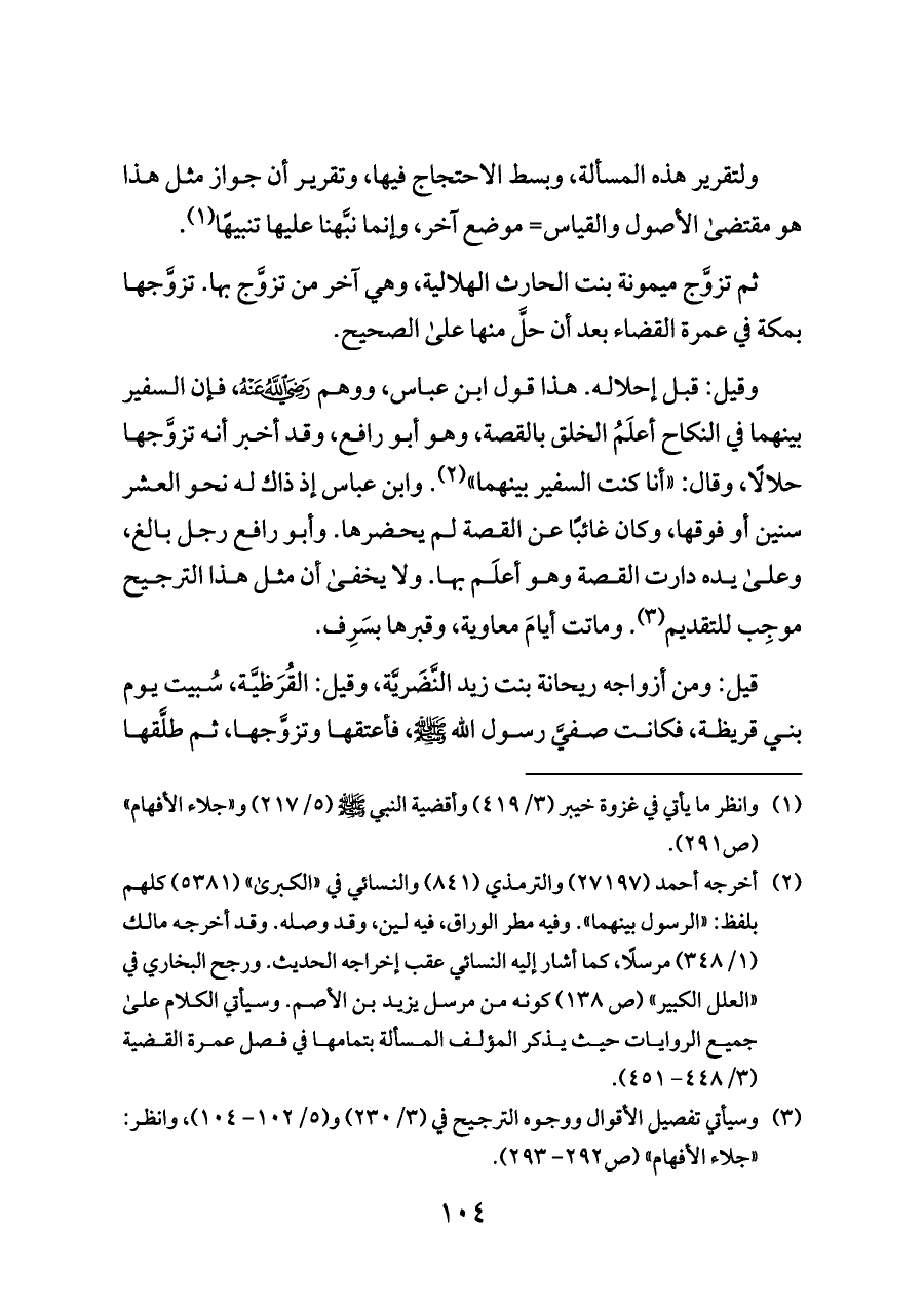 وقيل: قبل إحلاله. هذا قول ابن عباس، ووهم - رضي الله عنه -، فإن السفير بينهما في النكاح أعلَمُ الخلق بالقصة، وهو أبو رافع، وقد أخبر أنه تزوَّجها حلالًا، وقال: «أنا كنت السفير بينهما» (¬٢). وابن عباس إذ ذاك له نحو العشر سنين أو فوقها، وكان غائبًا عن القصة لم يحضرها. وأبو رافع رجل بالغ، وعلى يده دارت القصة وهو أعلَم بها. ولا يخفى أن مثل هذا الترجيح موجِب للتقديم (¬٣). وماتت أيامَ معاوية، وقبرها بسَرِف.