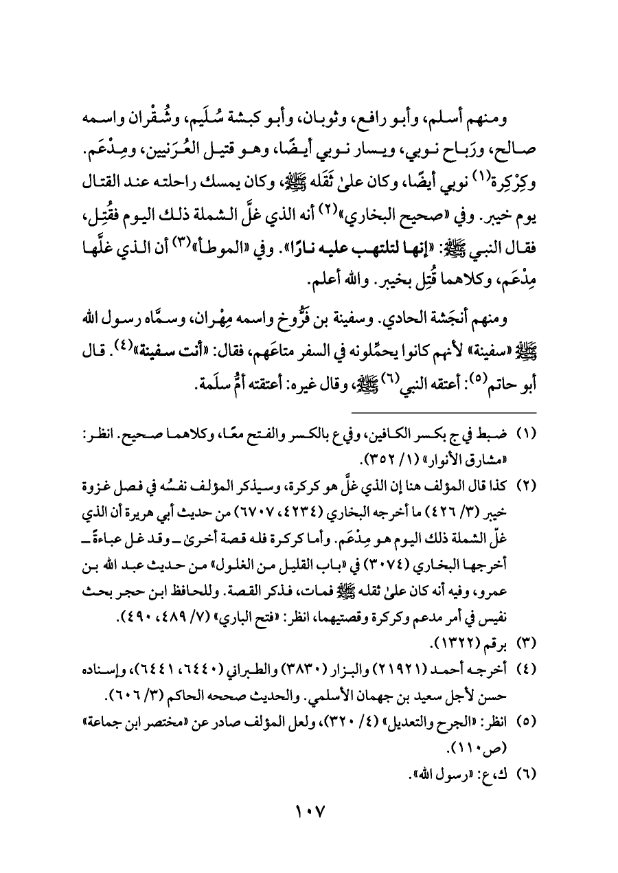 ومنهم أسلم، وأبو رافع، وثوبان، وأبو كبشة سُلَيم، وشُقْران واسمه صالح، ورَباح نوبي، ويسار نوبي أيضًا، وهو قتيل العُرَنيين، ومِدْعَم. وكِرْكِرة (¬١) نوبي أيضًا، وكان على ثَقَله - صلى الله عليه وسلم -، وكان يمسك راحلته عند القتال يوم خيبر. وفي «صحيح البخاري» (¬٢) أنه الذي غلَّ الشملة ذلك اليوم فقُتِل، فقال النبي - صلى الله عليه وسلم -: «إنها لتلتهب عليه نارًا». وفي «الموطأ» (¬٣) أن الذي غلَّها مِدْعَم، وكلاهما قُتِل بخيبر. والله أعلم.