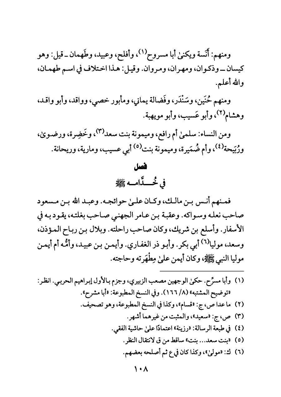 فمنهم أنس بن مالك، وكان على حوائجه. وعبد الله بن مسعود صاحب نعله وسواكه. وعقبة بن عامر الجهني صاحب بغلته، يقود به في الأسفار. وأسلع بن شريك، وكان صاحب راحلته. وبلال بن رباح المؤذن، وسعد، موليا (¬٦) أبي بكر. وأبو ذر الغفاري. وأيمن بن عبيد، وأمُّه أم أيمن موليا النبي - صلى الله عليه وسلم -، وكان أيمن على مِطْهَرته وحاجته.