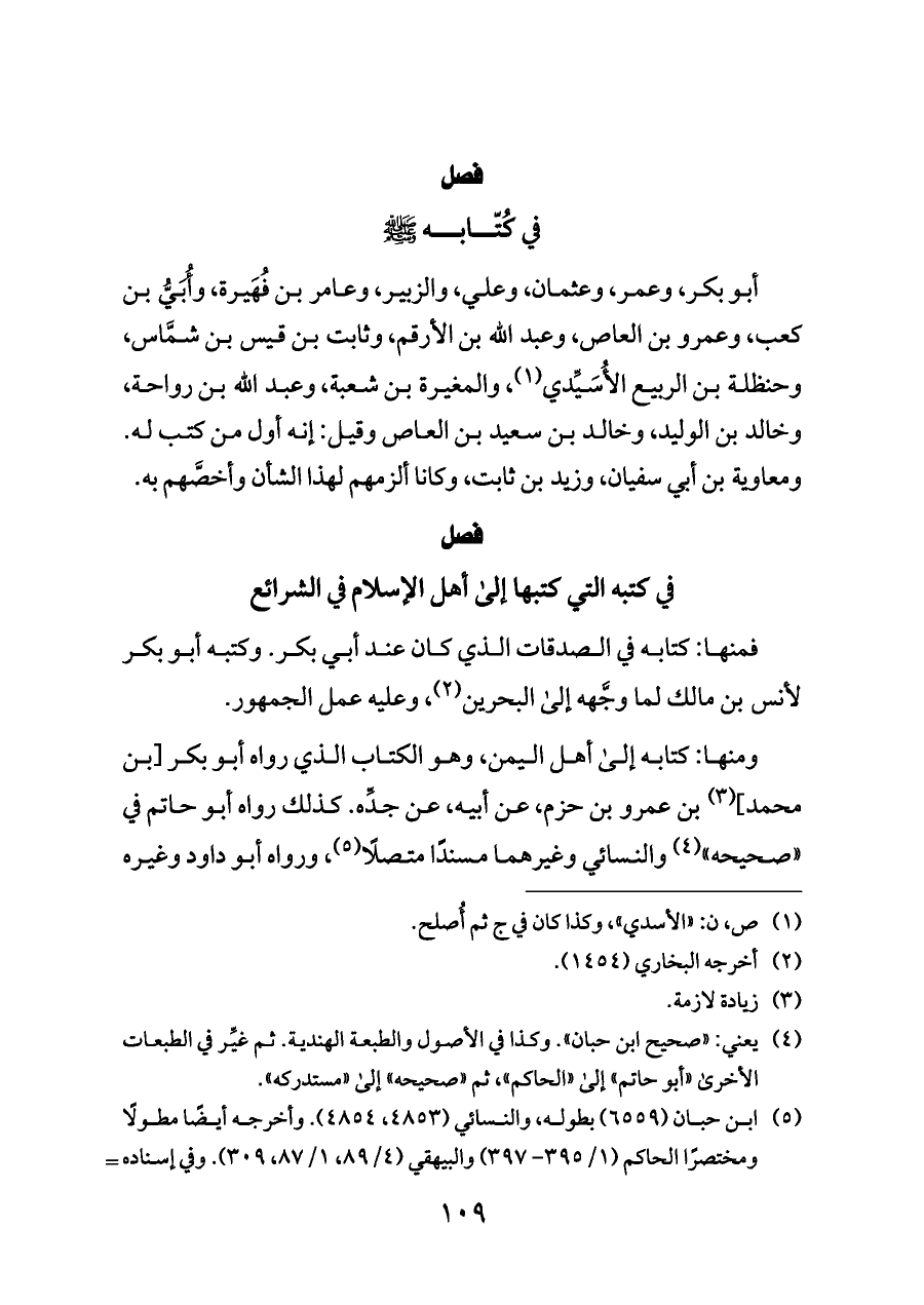 ومنها: كتابه إلى أهل اليمن، وهو الكتاب الذي رواه أبو بكر [بن محمد] (¬٣) بن عمرو بن حزم، عن أبيه، عن جدِّه. كذلك رواه أبو حاتم في «صحيحه» (¬٤) والنسائي وغيرهما مسندًا متصلًا (¬٥)، ورواه أبو داود وغيره