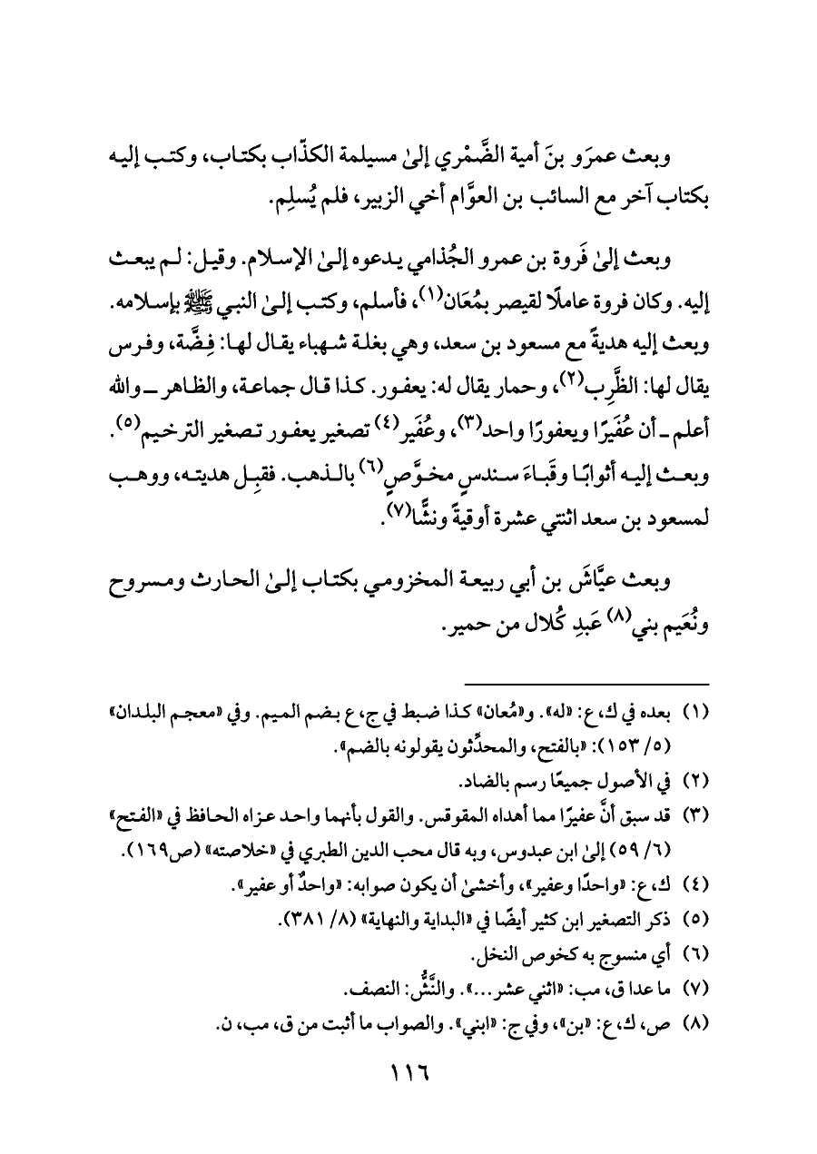 وبعث إلى فَروة بن عمرو الجُذامي يدعوه إلى الإسلام. وقيل: لم يبعث إليه. وكان فروة عاملًا لقيصر بمُعَان (¬١)، فأسلم، وكتب إلى النبي - صلى الله عليه وسلم - بإسلامه. وبعث إليه هديةً مع مسعود بن سعد، وهي بغلة شهباء يقال لها: فِضَّة، وفرس يقال لها: الظَّرِب (¬٢)، وحمار يقال له: يعفور. كذا قال جماعة، والظاهر ــ والله أعلم ــ أن عُفَيرًا ويعفورًا واحد (¬٣)، وعُفَير (¬٤) تصغير يعفور تصغير الترخيم (¬٥). وبعث إليه أثوابًا وقَباءَ سندسٍ مخوَّصٍ (¬٦) بالذهب. فقبِل هديته، ووهب لمسعود بن سعد اثنتي عشرة أوقيةً ونشًّا (¬٧).
