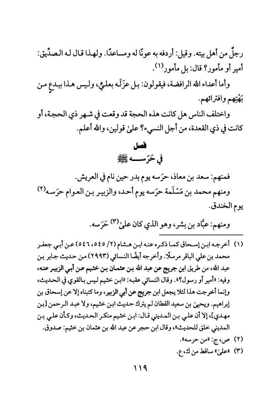 (¬١) أخرجه ابن إسحاق كما ذكره عنه ابن هشام (٢/ ٥٤٥، ٥٤٦) عن أبي جعفر محمد بن علي الباقر مرسلًا. وأخرجه أيضًا النسائي (٢٩٩٣) من حديث جابر بن عبد الله، من طريق ابن جريج عن عبد الله بن عثمان بن خثيم عن أبي الزبير عنه، وفيه: «أمير أو رسول؟». وقال النسائي عقبه: «ابن خثيم ليس بالقوي في الحديث، وإنما أخرجت هذا لئلا يجعل ابن جريج عن أبي الزبير، وما كتبناه إلا عن إسحاق بن إبراهيم. ويحيى بن سعيد القطان لم يترك حديث ابن خثيم، ولا عبد الرحمن [بن مهدي]، إلا أن علي بن المديني قال: ابن خثيم منكر الحديث، وكأن علي بن المديني خلق للحديث»، وقال ابن حجر عن عبد الله بن عثمان بن خثيم: صدوق.