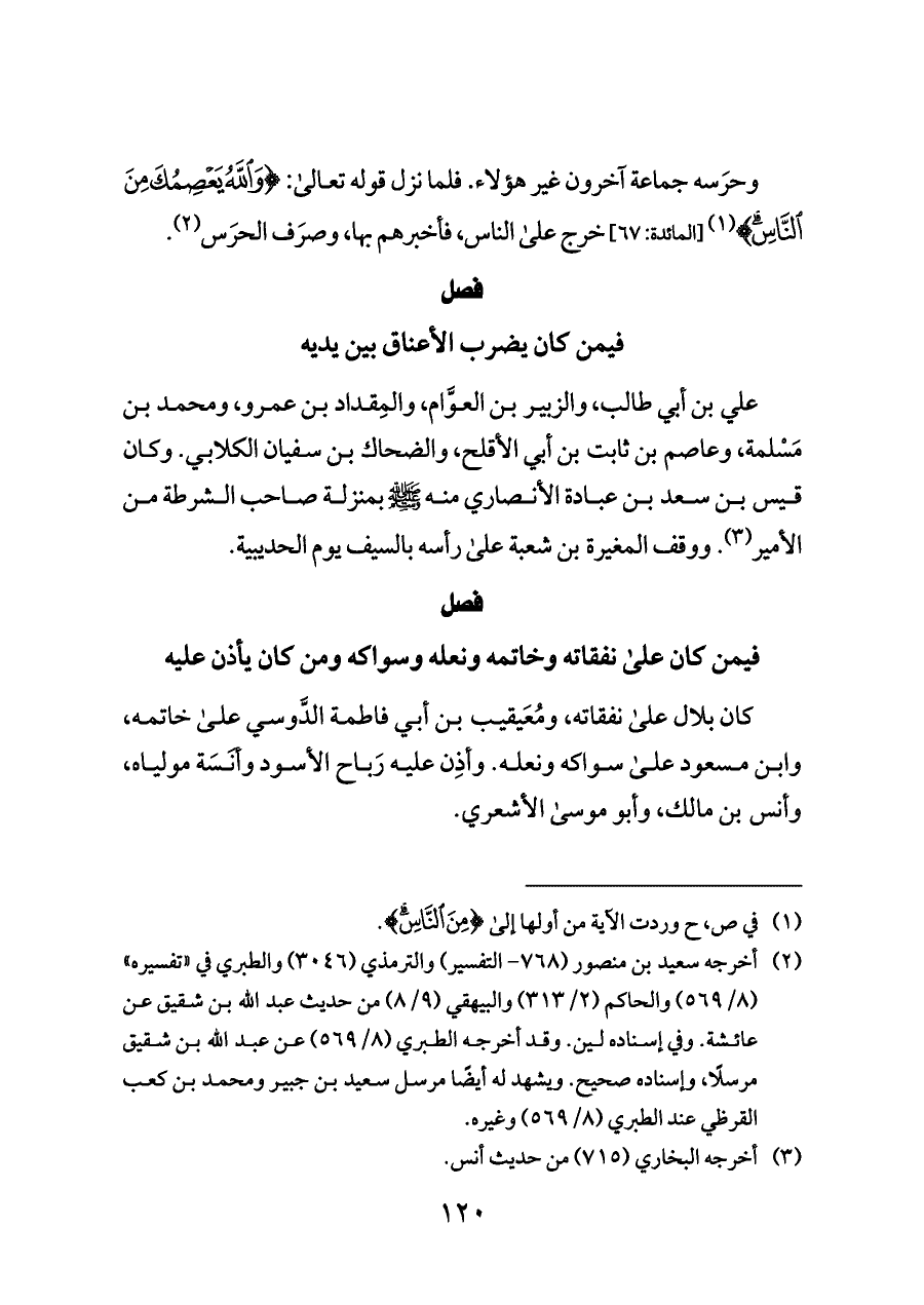 وحرَسه جماعة آخرون غير هؤلاء. فلما نزل قوله تعالى: {وَاللَّهُ يَعْصِمُكَ مِنَ النَّاسِ} (¬١) [المائدة: ٦٧] خرج على الناس، فأخبرهم بها، وصرَف الحرَس (¬٢).