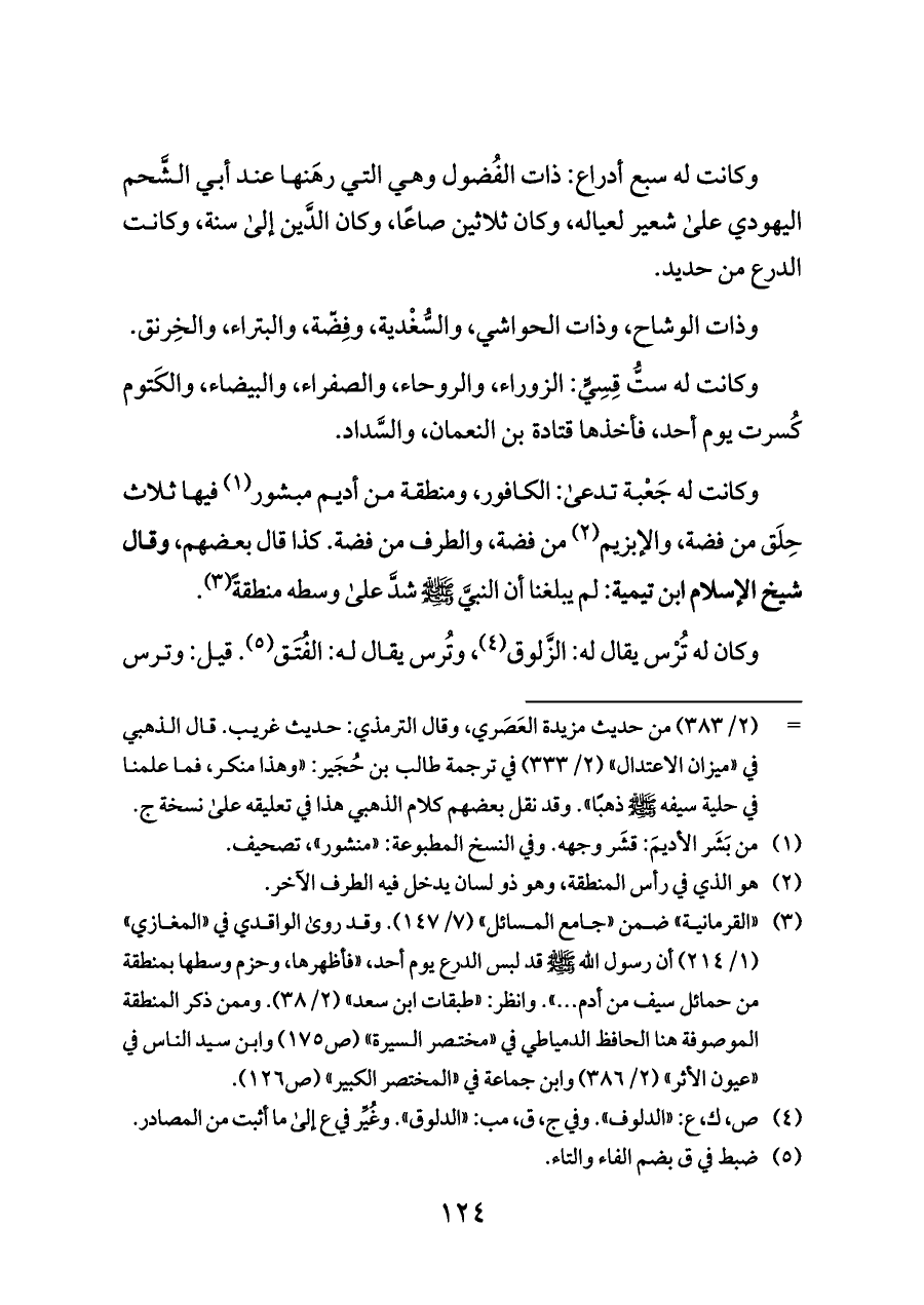 (¬٣) «القرمانية» ضمن «جامع المسائل» (٧/ ١٤٧). وقد روى الواقدي في «المغازي» (١/ ٢١٤) أن رسول الله - صلى الله عليه وسلم - قد لبس الدرع يوم أحد، «فأظهرها، وحزم وسطها بمنطقة من حمائل سيف من أدم ... ». وانظر: «طبقات ابن سعد» (٢/ ٣٨). وممن ذكر المنطقة الموصوفة هنا الحافظ الدمياطي في «مختصر السيرة» (ص ١٧٥) وابن سيد الناس في «عيون الأثر» (٢/ ٣٨٦) وابن جماعة في «المختصر الكبير» (ص ١٢٦).